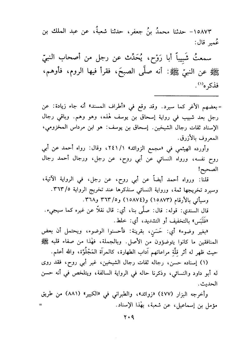 ١٥٨٧٣ - حَدَّثَنَا مُحَمَّدُ بْنُ جَعْفَرٍ، حَدَّثَنَا شُعْبَةُ، عَنْ عَبْدِ الْمَلِكِ بْنِ عُمَيْرٍ، قَالَ: سَمِعْتُ شَبِيبًا أَبَا رَوْحٍ يُحَدِّثُ، عَنْ رَجُلٍ مِنْ أَصْحَابِ النَّبِيِّ صَلَّى اللهُ عَلَيْهِ وَسَلَّمَ، عَنِ النَّبِيِّ صَلَّى اللهُ عَلَيْهِ وَسَلَّمَ أَنَّهُ: صَلَّى الصُّبْحَ فَقَرَأَ فِيهَا الرُّومَ فَأَوْهَمَ، فَذَكَرَهُ (١)