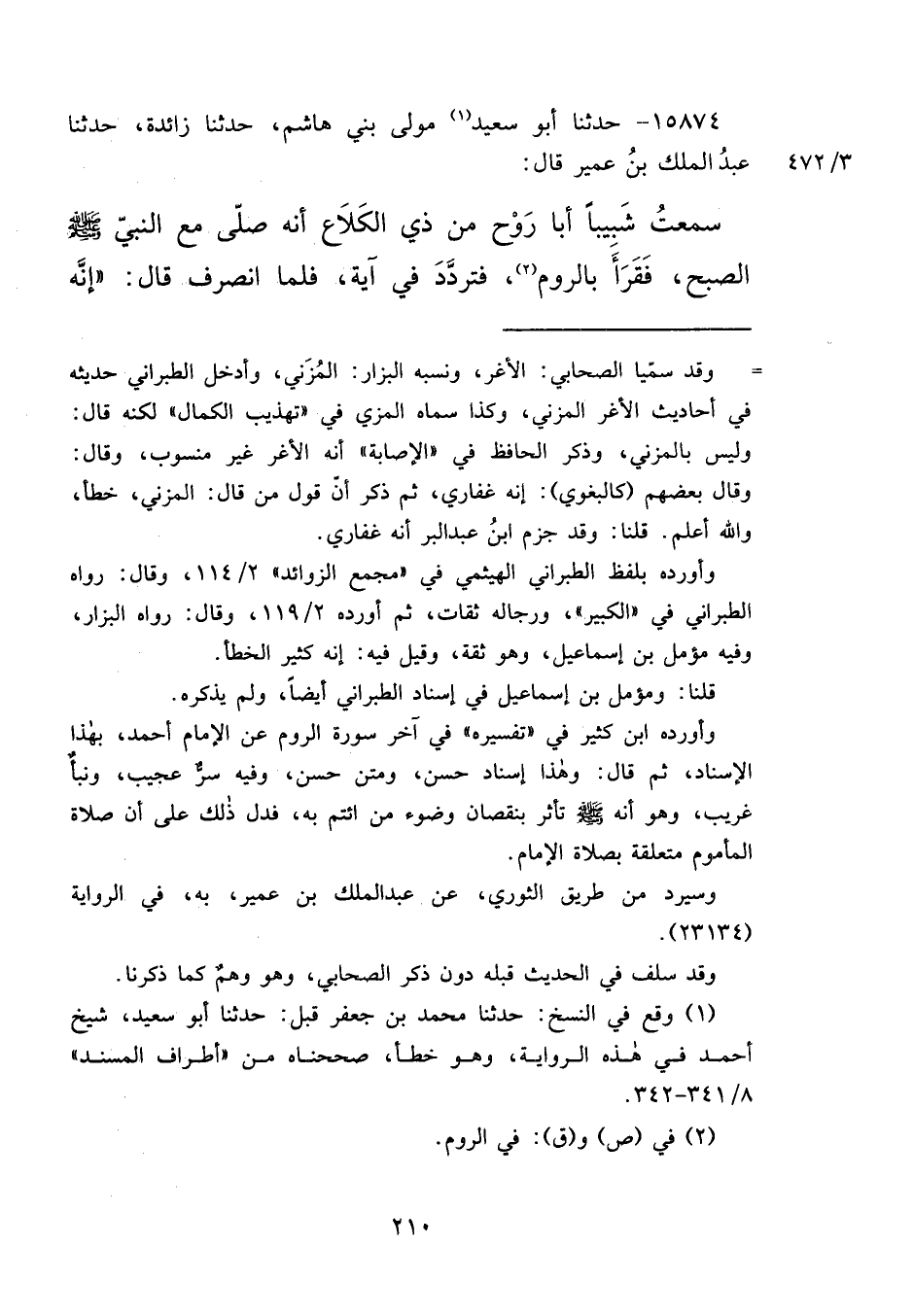 ١٥٨٧٤ - حَدَّثَنَا أَبُو سَعِيدٍ (١) ، مَوْلَى بَنِي هَاشِمٍ، حَدَّثَنَا زَائِدَةُ، حَدَّثَنَا عَبْدُ الْمَلِكِ بْنُ عُمَيْرٍ، قَالَ: سَمِعْتُ شَبِيبًا أَبَا رَوْحٍ، مِنْ ذِي الْكَلَاعِ،، أَنَّهُ صَلَّى مَعَ النَّبِيِّ صَلَّى اللهُ عَلَيْهِ وَسَلَّمَ الصُّبْحَ فَقَرَأَ بِالرُّومِ (٢) ، فَتَرَدَّدَ فِي آيَةٍ فَلَمَّا انْصَرَفَ قَالَ: " إِنَّهُ