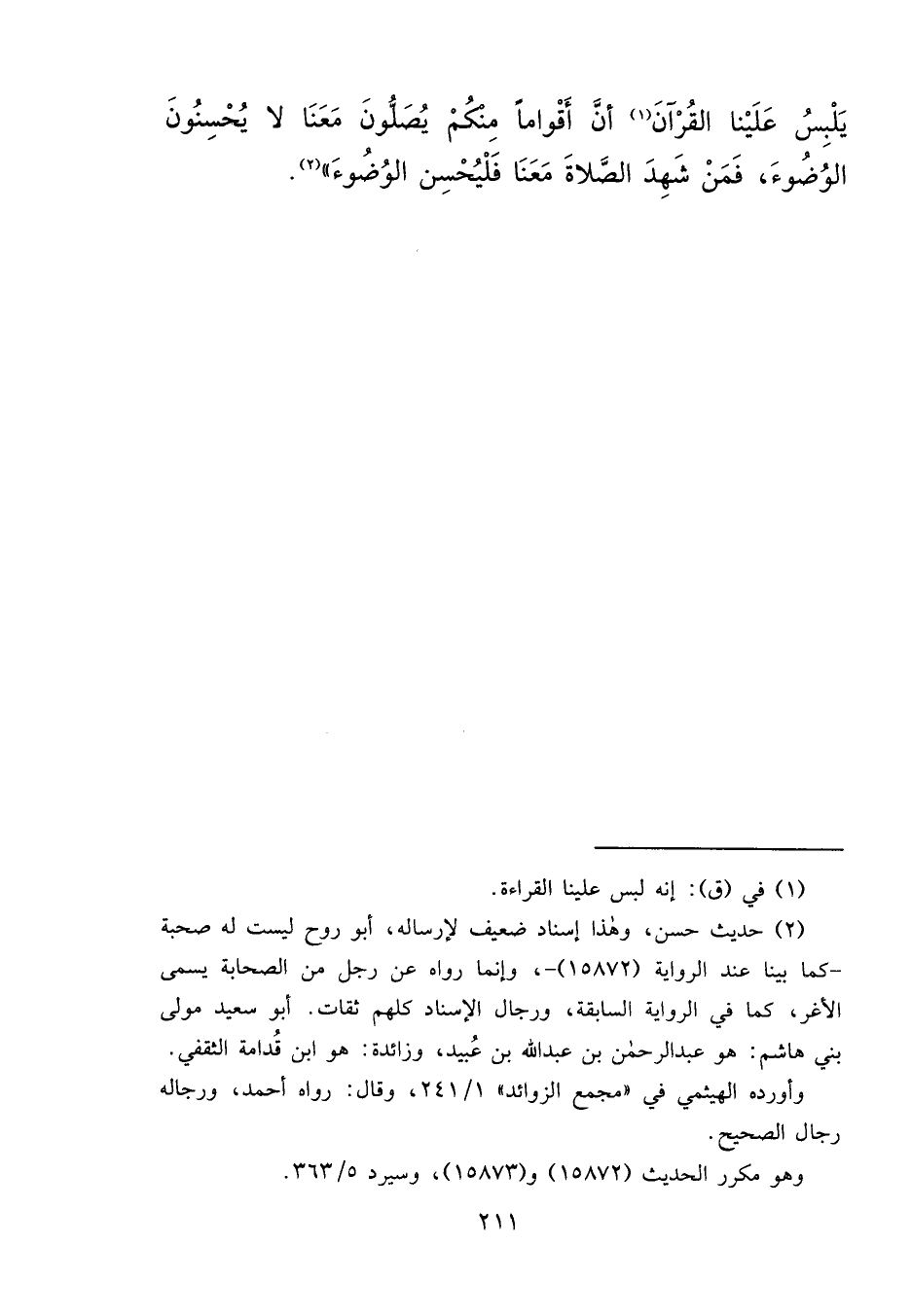 يَلْبِسُ عَلَيْنَا الْقُرْآنَ (١) ، أَنَّ أَقْوَامًا مِنْكُمْ يُصَلُّونَ مَعَنَا لَا يُحْسِنُونَ الْوُضُوءَ، فَمَنْ شَهِدَ الصَّلَاةَ مَعَنَا فَلْيُحْسِنِ الْوُضُوءَ " (٢)