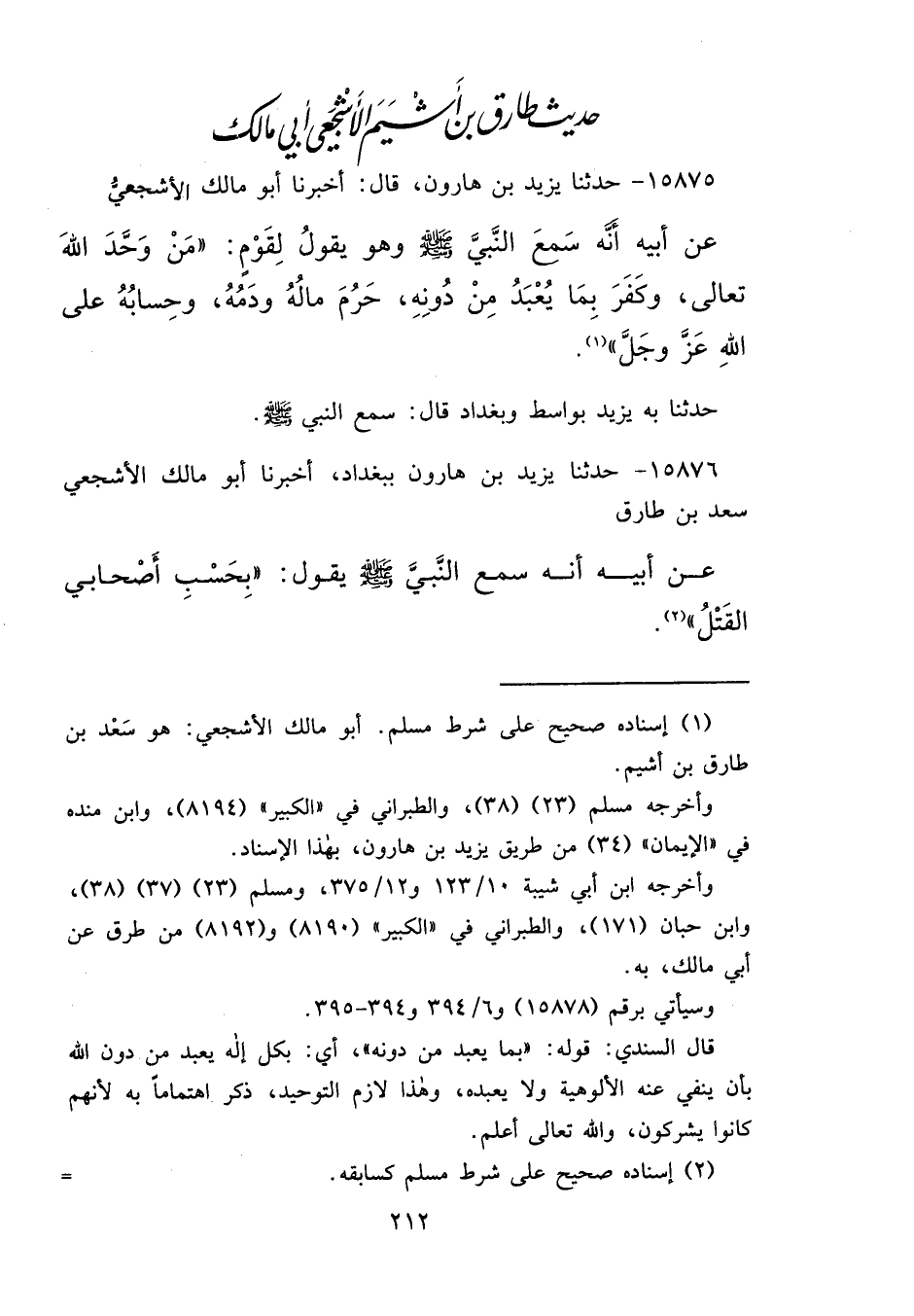 ١٥٨٧٥ - حَدَّثَنَا يَزِيدُ بْنُ هَارُونَ، قَالَ: أَخْبَرَنَا أَبُو مَالِكٍ الْأَشْجَعِيُّ، عَنْ أَبِيهِ، أَنَّهُ سَمِعَ النَّبِيَّ صَلَّى اللهُ عَلَيْهِ وَسَلَّمَ وَهُوَ يَقُولُ لِقَوْمٍ: " مَنْ وَحَّدَ اللهَ تَعَالَى، وَكَفَرَ بِمَا يُعْبَدُ مِنْ دُونِهِ، حَرُمَ مَالُهُ وَدَمُهُ، وَحِسَابُهُ عَلَى اللهِ عَزَّ وَجَلَّ " (١) " حَدَّثَنَا بِهِ يَزِيدُ بِوَاسِطٍ، وَبَغْدَادَ، قَالَ: سَمِعَ النَّبِيَّ صَلَّى اللهُ عَلَيْهِ وَسَلَّمَ "