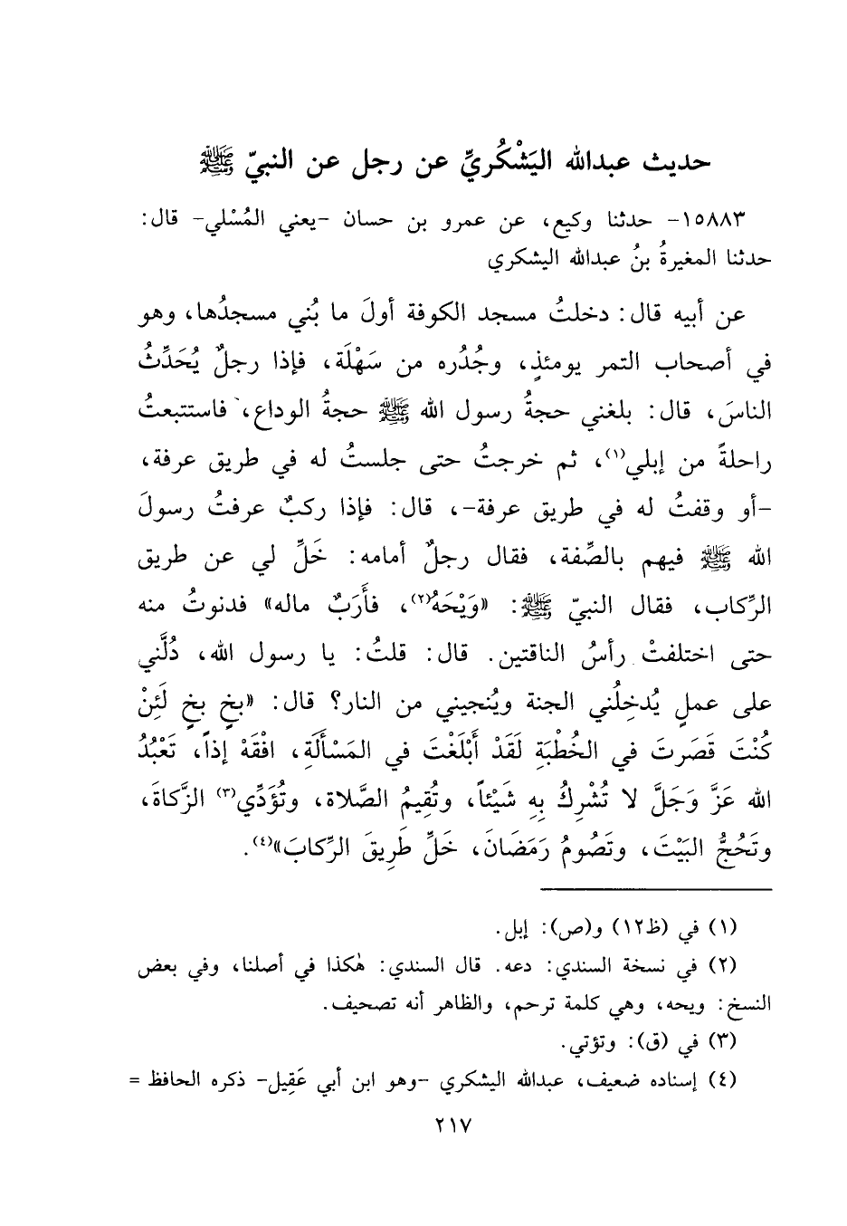١٥٨٨٣ - حَدَّثَنَا وَكِيعٌ، عَنْ عَمْرِو بْنِ حَسَّانَ يَعْنِي الْمُسْلِيَّ، قَالَ: حَدَّثَنَا الْمُغِيرَةُ بْنُ عَبْدِ اللهِ الْيَشْكُرِيُّ، عَنْ أَبِيهِ، قَالَ: دَخَلْتُ مَسْجِدَ الْكُوفَةِ أَوَّلَ مَا بُنِيَ مَسْجِدُهَا، وَهُوَ فِي أَصْحَابِ التَّمْرِ يَوْمَئِذٍ، وَجُدُرُهُ مِنْ سِهْلَةٍ، فَإِذَا رَجُلٌ يُحَدِّثُ النَّاسَ، قَالَ: بَلَغَنِي حَجَّةُ رَسُولِ اللهِ صَلَّى اللهُ عَلَيْهِ وَسَلَّمَ، حَجَّةُ الْوَدَاعِ، فَاسْتَتْبَعْتُ رَاحِلَةً مِنْ إِبِلِي (١) ، ثُمَّ خَرَجْتُ حَتَّى جَلَسْتُ لَهُ فِي طَرِيقِ عَرَفَةَ - أَوْ وَقَفْتُ لَهُ فِي طَرِيقِ عَرَفَةَ - قَالَ: فَإِذَا رَكْبٌ عَرَفْتُ رَسُولَ اللهِ صَلَّى اللهُ عَلَيْهِ وَسَلَّمَ فِيهِمْ بِالصِّفَةِ، فَقَالَ رَجُلٌ أَمَامَهُ: خَلِّ لِي عَنْ طَرِيقِ الرِّكَابِ، فَقَالَ النَّبِيُّ صَلَّى اللهُ عَلَيْهِ وَسَلَّمَ: " وَيْحَهُ (٢) فَأَرَبٌ مَا لَهُ " فَدَنَوْتُ مِنْهُ حَتَّى اخْتَلَفَتْ رَأْسُ النَّاقَتَيْنِ، قَالَ: قُلْتُ: يَا رَسُولَ اللهِ، دُلَّنِي عَلَى عَمَلٍ يُدْخِلُنِي الْجَنَّةَ، وَيُنْجِينِي مِنَ النَّارِ، قَالَ: " بَخٍ بَخٍ، لَئِنْ كُنْتَ قَصَّرْتَ فِي الْخُطْبَةِ، لَقَدْ أَبْلَغْتَ فِي الْمَسْأَلَةِ افْقَهْ إِذًا، تَعْبُدُ اللهَ عَزَّ وَجَلَّ لَا تُشْرِكُ بِهِ شَيْئًا، وَتُقِيمُ الصَّلَاةَ، وَتُؤَدِّي (٣) الزَّكَاةَ، وَتَحُجُّ الْبَيْتَ، وَتَصُومُ رَمَضَانَ، خَلِّ طَرِيقَ الرِّكَابِ " (٤)
