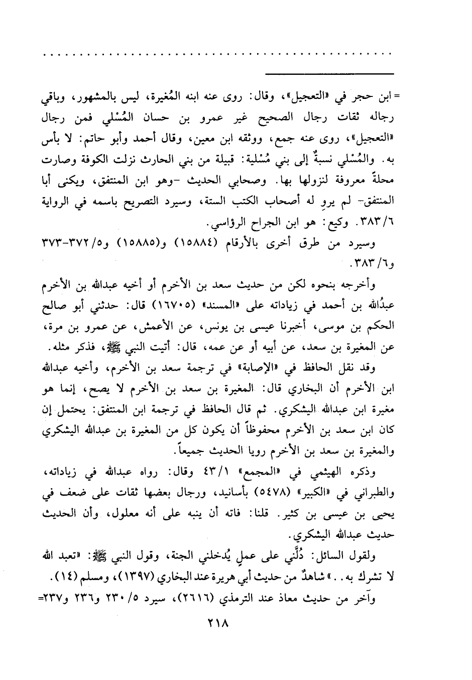 وقد نقل الحافظ في "الإصابة" في ترجمة سعد بن الأخرم، وأخيه عبد الله ابن الأخرم أن البخاري قال: المغيرة بن سعد بن الأخرم لا يصح، إنما هو مغيرة ابن عبد الله اليشكري. ثم قال الحافظ في ترجمة ابن المنتفق: يحتمل إن كان ابن سعد بن الأخرم محفوظاً أن يكون كل من المغيرة بن عبد الله اليشكري والمغيرة بن سعد بن الأخرم رويا الحديث جميعاً.