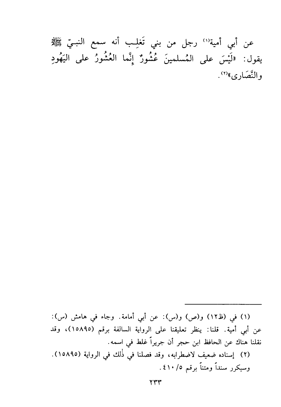 عَنْ أَبِي أُمِّية (١) ، رَجُلٌ مِنْ بَنِي تَغْلِبَ، أَنَّهُ سَمِعَ النَّبِيَّ صَلَّى اللهُ عَلَيْهِ وَسَلَّمَ يَقُولُ: " لَيْسَ عَلَى الْمُسْلِمِينَ عُشُورٌ، إِنَّمَا الْعُشُورُ عَلَى الْيَهُودِ، وَالنَّصَارَى " (٢)