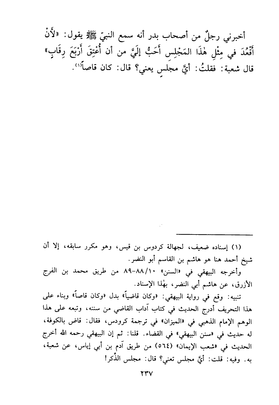 أَخْبَرَنِي رَجُلٌ، مِنْ أَصْحَابِ بَدْرٍ، أَنَّهُ سَمِعَ النَّبِيَّ صَلَّى اللهُ عَلَيْهِ وَسَلَّمَ يَقُولُ: " لَأَنْ أَقْعُدَ فِي مِثْلِ هَذَا الْمَجْلِسِ أَحَبُّ إِلَيَّ مِنْ أَنْ أُعْتِقَ أَرْبَعَ رِقَابٍ " قَالَ شُعْبَةُ: فَقُلْتُ: أَيَّ مَجْلِسٍ يَعْنِي؟ قَالَ: كَانَ قَاصًّا (١)