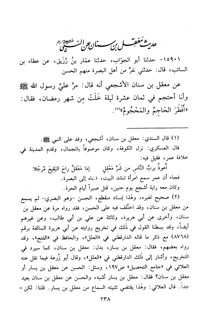 ١٥٩٠١ - حَدَّثَنَا أَبُو الْجَوَّابِ، حَدَّثَنَا عَمَّارُ بْنُ رُزَيْقٍ، عَنْ عَطَاءِ بْنِ السَّائِبِ، قَالَ: حَدَّثَنِي نَفَرٌ مِنْ أَهْلِ الْبَصْرَةِ، مِنْهُمُ الْحَسَنُ، عَنْ مَعْقِلِ بْنِ سِنَانٍ الْأَشْجَعِيِّ، أَنَّهُ قَالَ: مَرَّ عَلَيَّ رَسُولُ اللهِ صَلَّى اللهُ عَلَيْهِ وَسَلَّمَ وَأَنَا أَحْتَجِمُ فِي ثَمَانِ عَشْرَةَ لَيْلَةً، خَلَتْ مِنْ شَهْرِ رَمَضَانَ، فَقَالَ: " أَفْطَرَ الْحَاجِمُ وَالْمَحْجُومُ " (٢)