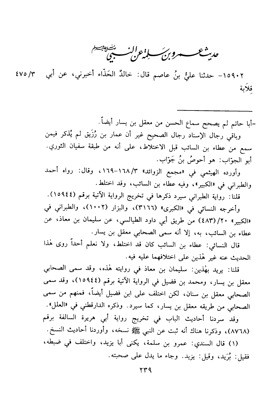قلنا: يريد بهذين: سليمان بن معاذ في روايته هذه، وقد سمى الصحابي معقل بن يسار، ومحمد بن فضيل في الرواية الآتية برقم (١٥٩٤٤) ، وقد سمى الصحابي معقل بن سنان، لكن اختلف على ابن فضيل أيضاً، فمنهم من سمى الصحابي من طريقه معقل بن يسار، كما سيرد. وذكره الدارقطني في "العلل".