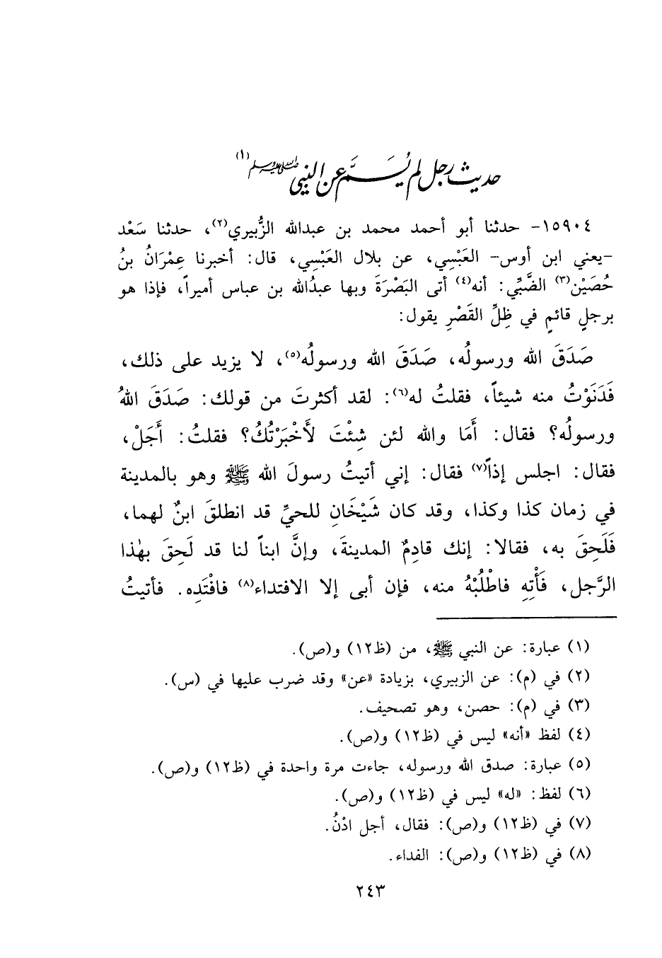 ١٥٩٠٤ - حَدَّثَنَا أَبُو أَحْمَدَ مُحَمَّدُ بْنُ عَبْدِ اللهِ الزُّبَيْرِيُّ (٢) ، حَدَّثَنَا سَعْدٌ يَعْنِي ابْنَ أَوْسٍ الْعَبْسِيَّ، عَنْ بِلَالٍ الْعَبْسِيِّ، قَالَ: أَخْبَرَنَا عِمْرَانُ بْنُ حُصَيْنٍ (٣) الضَّبِّيُّ، أَنَّهُ (٤) أَتَى الْبَصْرَةَ وَبِهَا عَبْدُ اللهِ بْنُ عَبَّاسٍ أَمِيرًا، فَإِذَا هُوَ بِرَجُلٍ قَائِمٍ فِي ظِلِّ الْقَصْرِ، يَقُولُ: صَدَقَ اللهُ وَرَسُولُهُ، صَدَقَ اللهُ وَرَسُولُهُ (٥) ، لَا يَزِيدُ عَلَى ذَلِكَ، فَدَنَوْتُ مِنْهُ شَيْئًا، فَقُلْتُ لَهُ (٦) : لَقَدْ أَكْثَرْتَ مِنْ قَوْلِكَ: صَدَقَ اللهُ وَرَسُولُهُ، فَقَالَ: أَمَا وَاللهِ لَئِنْ شِئْتَ لَأَخْبَرْتُكَ، فَقُلْتُ: أَجَلْ، فَقَالَ: اجْلِسْ إِذًا (٧) ، فَقَالَ: إِنِّي أَتَيْتُ رَسُولَ اللهِ صَلَّى اللهُ عَلَيْهِ وَسَلَّمَ وَهُوَ بِالْمَدِينَةِ فِي زَمَانِ كَذَا وَكَذَا، وَقَدْ كَانَ شَيْخَانِ لِلْحَيِّ قَدِ انْطَلَقَ ابْنٌ لَهُمَا فَلَحِقَ بِهِ، فَقَالَا: إِنَّكَ قَادِمٌ الْمَدِينَةَ، وَإِنَّ ابْنًا لَنَا قَدْ لَحِقَ بِهَذَا الرَّجُلِ، فَأْتِهِ فَاطْلُبْهُ مِنْهُ، فَإِنْ أَبَى إِلَّا الِافْتِدَاءَ (٨) فَافْتَدِهِ، فَأَتَيْتُ