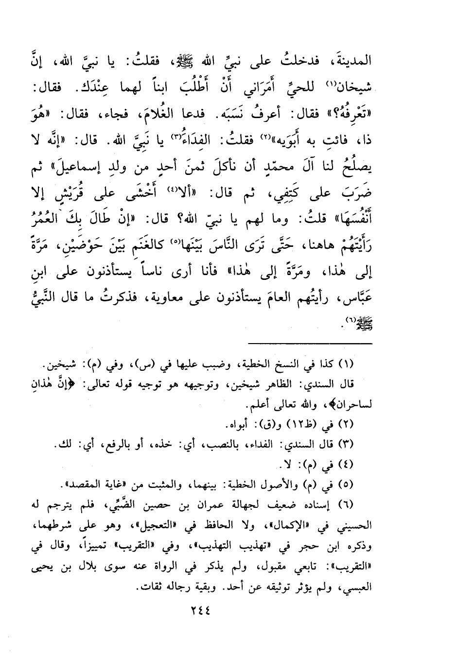 الْمَدِينَةَ فَدَخَلْتُ عَلَى نَبِيِّ اللهِ صَلَّى اللهُ عَلَيْهِ وَسَلَّمَ، فَقُلْتُ: يَا نَبِيَّ اللهِ إِنَّ شَيْخَاْنِ (١) لِلْحَيِّ أَمَرَانِي أَنْ أَطْلُبَ ابْنًا لَهُمَا عِنْدَكَ، فَقَالَ: " تَعْرِفُهُ؟ "، فَقَالَ: أَعْرِفُ نَسَبَهُ فَدَعَا الْغُلَامَ فَجَاءَ، فَقَالَ: " هُوَ ذَا، فَاْئتِ بِهِ أَبَوَيْهِ " (٢) ، فَقُلْتُ: الْفِدَاءَ (٣) يَا نَبِيَّ اللهِ، قَالَ: " إِنَّهُ لَا يَصْلُحُ لَنَا آلُ مُحَمَّدٍ أَنْ نَأْكُلَ ثَمَنَ أَحَدٍ مِنْ وَلَدِ إِسْمَاعِيلَ "، ثُمَّ ضَرَبَ عَلَى كَتِفِي، ثُمَّ قَالَ: " ألَا (٤) أَخْشَى عَلَى قُرَيْشٍ إِلَّا أَنْفُسَهَا " قُلْتُ: وَمَا لَهُمْ يَا نَبِيَّ اللهِ؟ قَالَ: " إِنْ طَالَ بِكَ الْعُمُرُ رَأَيْتَهُمْ هَاهُنَا، حَتَّى تَرَى النَّاسَ بَيْنَهَا (٥) كَالْغَنَمِ بَيْنَ حَوْضَيْنِ مَرَّةً إِلَى هَذَا، وَمَرَّةً إِلَى هَذَا " فَأَنَا أَرَى نَاسًا يَسْتَأْذِنُونَ عَلَى ابْنِ عَبَّاسٍ، رَأَيْتُهُمُ الْعَامَ يَسْتَأْذِنُونَ عَلَى مُعَاوِيَةَ، فَذَكَرْتُ مَا قَالَ النَّبِيُّ صَلَّى اللهُ عَلَيْهِ وَسَلَّمَ (٦)