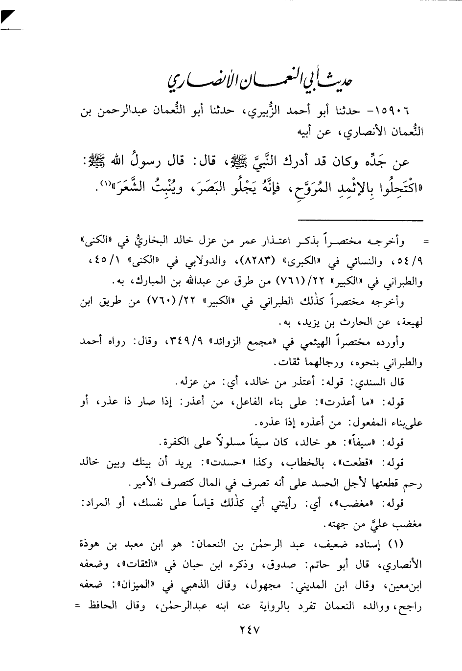 ١٥٩٠٦ - حَدَّثَنَا أَبُو أَحْمَدَ الزُّبَيْرِيُّ، حَدَّثَنَا أَبُو النُّعْمَانِ عَبْدُ الرَّحْمَنِ بْنِ النُّعْمَانِ الْأَنْصَارِيُّ، عَنْ أَبِيهِ، عَنْ جَدِّهِ وَكَانَ قَدْ أَدْرَكَ النَّبِيَّ صَلَّى اللهُ عَلَيْهِ وَسَلَّمَ، قَالَ: قَالَ رَسُولُ اللهِ صَلَّى اللهُ عَلَيْهِ وَسَلَّمَ: " اكْتَحِلُوا بِالْإِثْمِدِ الْمُرَوَّحِ، فَإِنَّهُ يَجْلُو الْبَصَرَ، وَيُنْبِتُ الشَّعْرَ " (١)