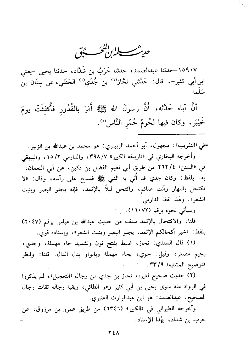 (٢) حديث صحيح لغيره، نحاز بن جدي من رجال "التعجيل"، لم يذكروا في الرواة عنه سوى يحيى بن أبي كثير وهو الطائي، وبقية رجاله ثقات رجال الصحيح. عبد الصمد: هو ابن عبد الوارث العنبري.