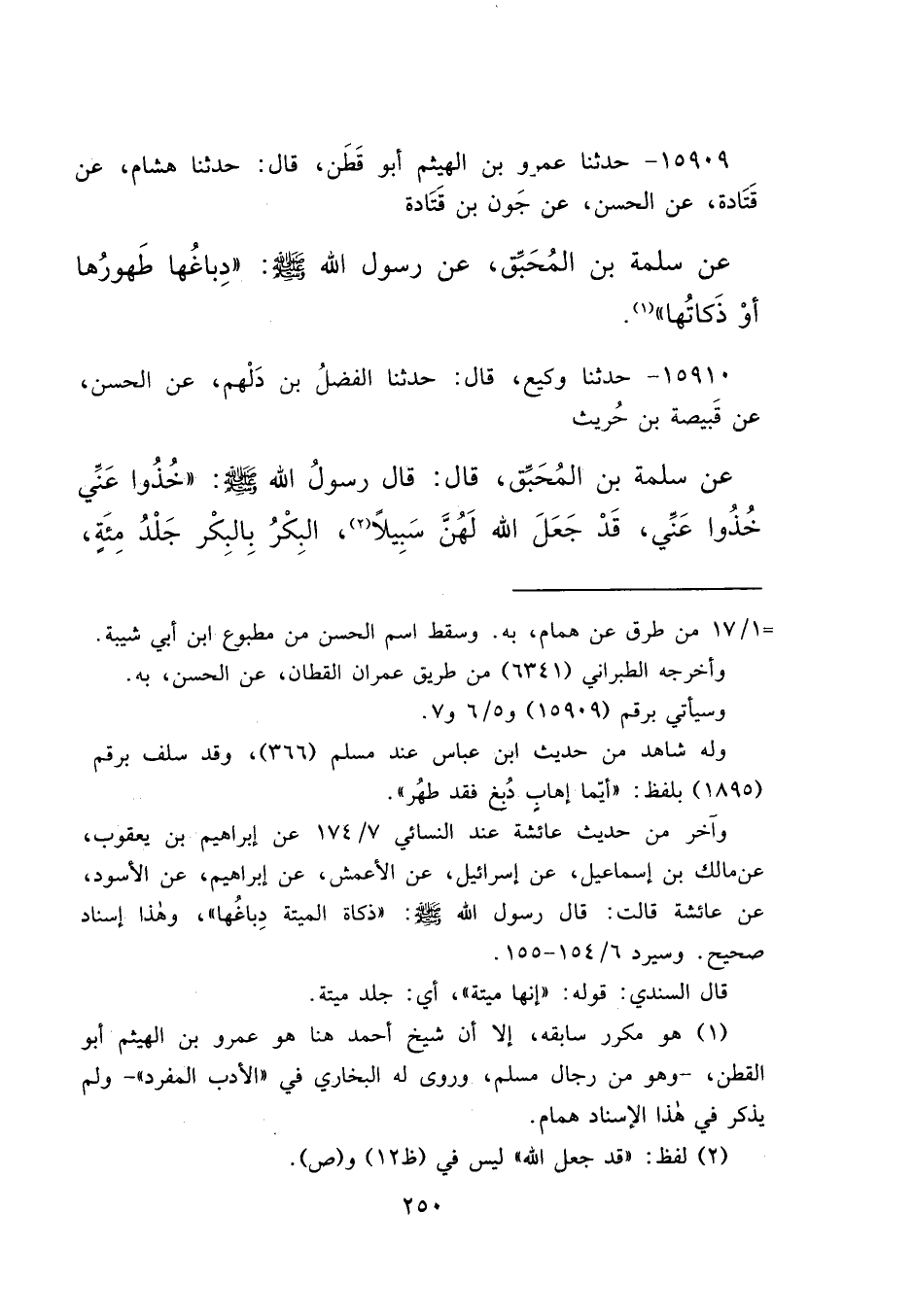 ١٥٩٠٩ - حَدَّثَنَا عَمْرُو بْنُ الْهَيْثَمِ أَبُو قَطَنٍ، قَالَ: حَدَّثَنَا هِشَامٌ، عَنْ قَتَادَةَ، عَنِ الْحَسَنِ، عَنْ جَوْنِ بْنِ قَتَادَةَ، عَنْ سَلَمَةَ بْنِ الْمُحَبِّقِ، عَنْ رَسُولِ اللهِ صَلَّى اللهُ عَلَيْهِ وَسَلَّمَ: " دِبَاغُهَا طُهُورُهَا أَوْ ذَكَاتُهَا " (١)
