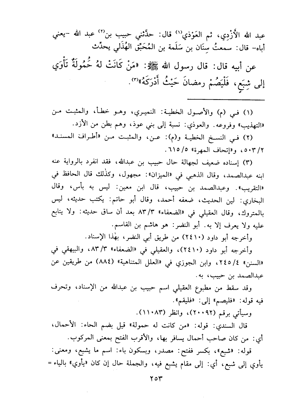 عَبْدِ اللهِ الْأَزْدِيِّ ثُمَّ الْعَوْذِيِّ (١) ، قَالَ: حَدَّثَنِي حَبِيبُ بْنُ (٢) عَبْدِ اللهِ يَعْنِي أَبَاهُ، قَالَ: سَمِعْتُ سِنَانَ بْنَ سَلَمَةَ بْنِ الْمُحَبِّقِ الْهُذَلِيَّ، يُحَدِّثُ عَنْ أَبِيهِ، قَالَ: قَالَ رَسُولُ اللهِ صَلَّى اللهُ عَلَيْهِ وَسَلَّمَ: " مَنْ كَانَتْ لَهُ حَمُولَةٌ تَأْوِي إِلَى شِبَعٍ فَلْيَصُمْ رَمَضَانَ حَيْثُ أَدْرَكَهُ " (٣)