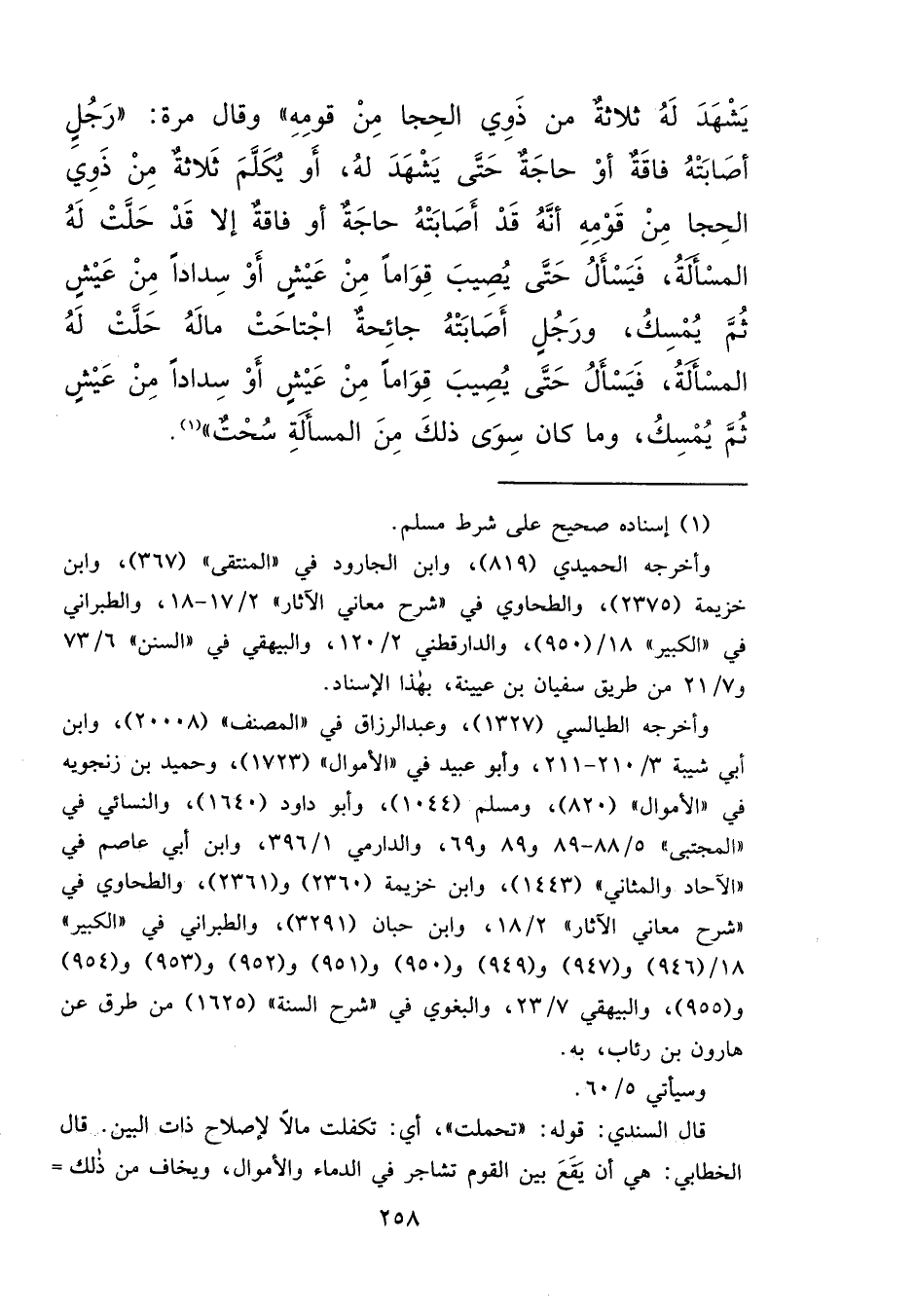 يَشْهَدَ لَهُ ثَلَاثَةٌ مِنْ ذَوِي الْحِجَا مِنْ قَوْمِهِ " وَقَالَ مَرَّةً: " رَجُلٍ أَصَابَتْهُ فَاقَةٌ - أَوْ حَاجَةٌ - حَتَّى يَشْهَدَ لَهُ - أَوْ يَكَلَّمَ - ثَلَاثَةٌ مِنْ ذَوِي الْحِجَا مِنْ قَوْمِهِ، أَنَّهُ قَدْ أَصَابَتْهُ حَاجَةٌ أَوْ فَاقَةٌ، إِلَّا قَدْ حَلَّتْ لَهُ الْمَسْأَلَةُ فَيَسْأَلُ حَتَّى يُصِيبَ قِوَامًا مِنْ عَيْشٍ أَوْ سِدَادًا مِنْ عَيْشٍ ثُمَّ يُمْسِكَ، وَرَجُلٍ أَصَابَتْهُ جَائِحَةٌ اجْتَاحَتْ مَالَهُ حَلَّتْ لَهُ الْمَسْأَلَةُ، فَيَسْأَلُ حَتَّى يُصِيبَ قِوَامًا مِنْ عَيْشٍ أَوْ سَدَادًا مِنْ عَيْشٍ ثُمَّ يُمْسِكَ وَمَا كَانَ سِوَى ذَلِكَ مِنَ الْمَسْأَلَةِ سُحْتٌ " (١)