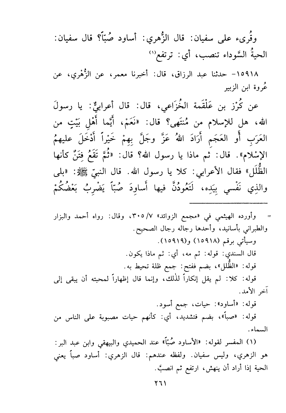 ١٥٩١٨ - حَدَّثَنَا عَبْدُ الرَّزَّاقِ، قَالَ: أَخْبَرَنَا مَعْمَرٌ، عَنِ الزُّهْرِيِّ، عَنْ عُرْوَةَ بْنِ الزُّبَيْرِ، عَنْ كُرْزِ بْنِ عَلْقَمَةَ الْخُزَاعِيِّ، قَالَ: قَالَ أَعْرَابِيٌّ: يَا رَسُولَ اللهِ، هَلْ لِلْإِسْلَامِ مِنْ مُنْتَهَى؟ قَالَ: " نَعَمْ أَيُّمَا أَهْلِ بَيْتٍ مِنَ الْعَرَبِ، أَوِ الْعُجْمِ أَرَادَ اللهُ عَزَّ وَجَلَّ بِهِمْ خَيْرًا، أَدْخَلَ عَلَيْهِمُ الْإِسْلَامَ " قَالَ: ثُمَّ مَاذَا يَا رَسُولَ اللهِ؟ قَالَ: " ثُمَّ تَقَعُ فِتَنٌ كَأَنَّهَا الظُّلَلُ " فَقَالَ الْأَعْرَابِيُّ: كَلَّا يَا رَسُولَ اللهِ، قَالَ النَّبِيُّ صَلَّى اللهُ عَلَيْهِ وَسَلَّمَ: " بَلَى، وَالَّذِي نَفْسِي بِيَدِهِ لَتَعُودُنَّ فِيهَا أَسَاوِدَ صُبًّا يَضْرِبُ بَعْضُكُمْ