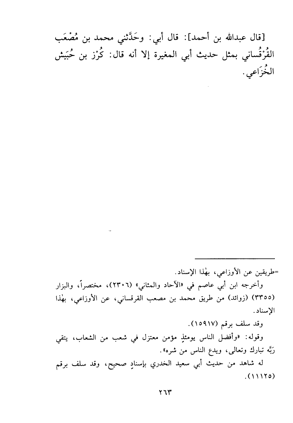 [قَالَ عَبْدُ اللهِ بْنُ أَحْمَدَ] قَالَ أَبِي: وحَدَّثَنِي مُحَمَّدُ بْنُ مُصْعَبٍ الْقُرْقُسَانِيُّ، مِثْلَ حَدِيثِ ابْنِ الْمُغِيرَةِ إِلَّا أَنَّهُ قَالَ: كُرْزُ بْنُ حُبَيْشٍ الْخُزَاعِيُّ