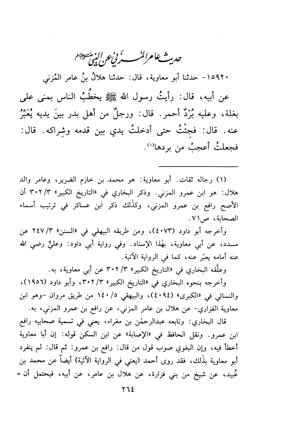 ١٥٩٢٠ - حَدَّثَنَا أَبُو مُعَاوِيَةَ، قَالَ: حَدَّثَنَا هِلَالُ بْنُ عَامِرٍ الْمُزَنِيُّ، عَنْ أَبِيهِ قَالَ: رَأَيْتُ رَسُولَ اللهِ صَلَّى اللهُ عَلَيْهِ وَسَلَّمَ يَخْطُبُ النَّاسَ بِمِنًى عَلَى بَغْلَةٍ، وَعَلَيْهِ بُرْدٌ أَحْمَرُ، قَالَ: وَرَجُلٌ مِنْ أَهْلِ بَدْرٍ بَيْنَ يَدَيْهِ يُعَبِّرُ عَنْهُ، قَالَ: فَجِئْتُ حَتَّى أَدْخَلْتُ يَدِي بَيْنَ قَدَمِهِ، وَشِرَاكِهِ، قَالَ: " فَجَعَلْتُ أَعْجَبُ مِنْ بَرَدِهَا " (١)