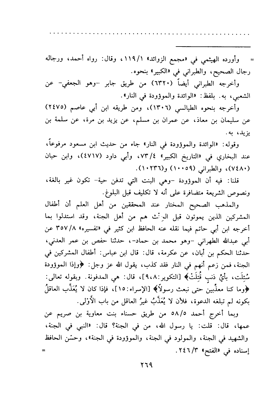 حدثنا الحكم بن أبان، عن عكرمة، قال: قال ابن عباس: أطفال المشركين في الجنة، فمن زعم أنهم في النار فقد كذب، يقول الله عز وجل: (وإذا الموؤودة سُئِلَت، بأيِّ ذنبِ قُتِلَتْ) [التكوير: ٨، ٩] ، قال: هي المدفونة. وبقوله تعالى: (وما كنا معذِّبين حتى نبعث رسولاً) [الإسراء: ١٥] ، فإذا كان لا يُعَذَّب العاقلُ بكونه لم تبلغه الدعوة، فلأن لا يُعَذَّبُ غيرُ العاقل من باب الأَوْلى.