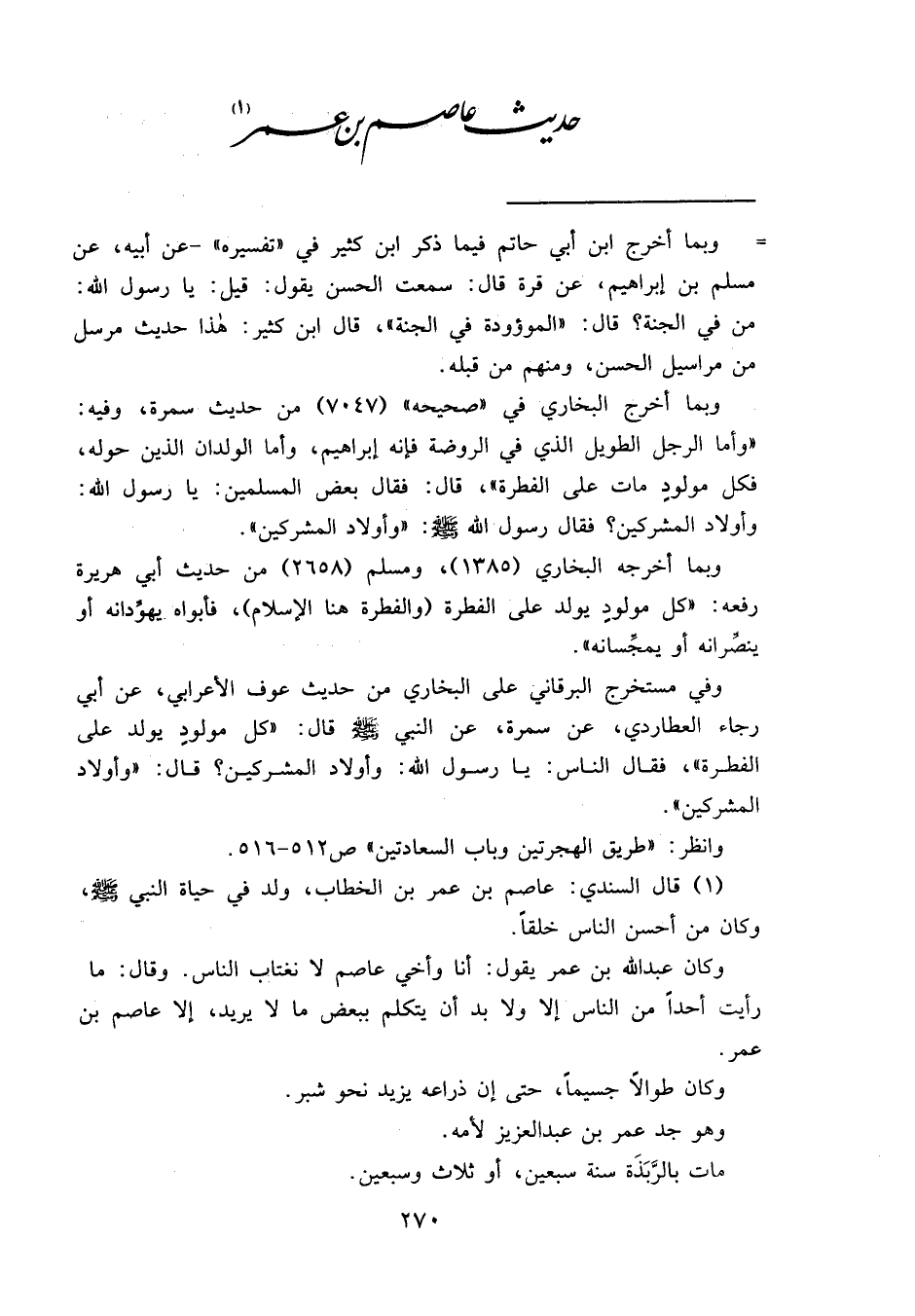 (١) قال السندي: عاصم بن عمر بن الخطاب، ولد في حياة النبي صَلَّى اللهُ عَلَيْهِ وَسَلَّمَ، وكان من أحسن الناس خلقاً.