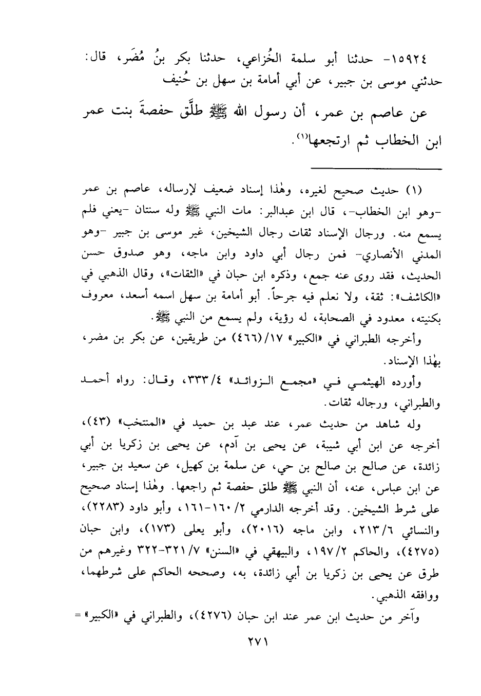 ١٥٩٢٤ - حَدَّثَنَا أَبُو سَلَمَةَ الْخُزَاعِيُّ، حَدَّثَنَا بَكْرُ بْنُ مُضَرَ، قَالَ: حَدَّثَنِي مُوسَى بْنُ جُبَيْرٍ، عَنْ أَبِي أُمَامَةَ بْنِ سَهْلِ بْنِ حُنَيْفٍ، عَنْ عَاصِمِ بْنِ عُمَرَ، " أَنَّ رَسُولَ اللهِ صَلَّى اللهُ عَلَيْهِ وَسَلَّمَ طَلَّقَ حَفْصَةَ بِنْتَ عُمَرَ بْنِ الْخَطَّابِ، ثُمَّ ارَتجَعَهَا " (١)