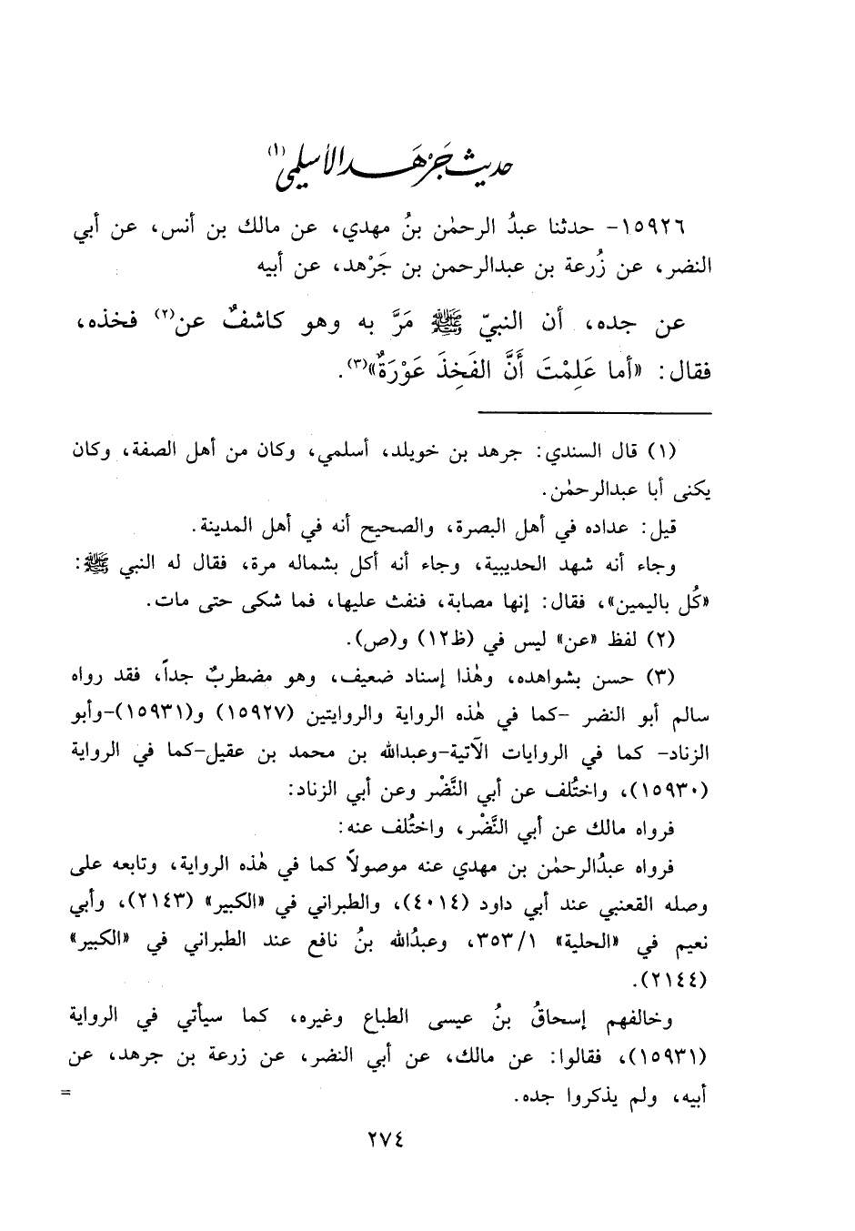 ١٥٩٢٦ - حَدَّثَنَا عَبْدُ الرَّحْمَنِ بْنُ مَهْدِيٍّ، عَنْ مَالِكِ بْنِ أَنَسٍ، عَنْ أَبِي النَّضْرِ، عَنْ زُرْعَةَ بْنِ عَبْدِ الرَّحْمَنِ بْنِ جَرْهَدٍ، عَنْ أَبِيهِ، عَنْ جَدِّهِ، أَنَّ النَّبِيَّ صَلَّى اللهُ عَلَيْهِ وَسَلَّمَ مَرَّ بِهِ وَهُوَ كَاشِفٌ عَنْ (٢) فَخِذِهِ، فَقَالَ: " أَمَا عَلِمْتَ أَنَّ الْفَخِذَ عَوْرَةٌ " (٣)