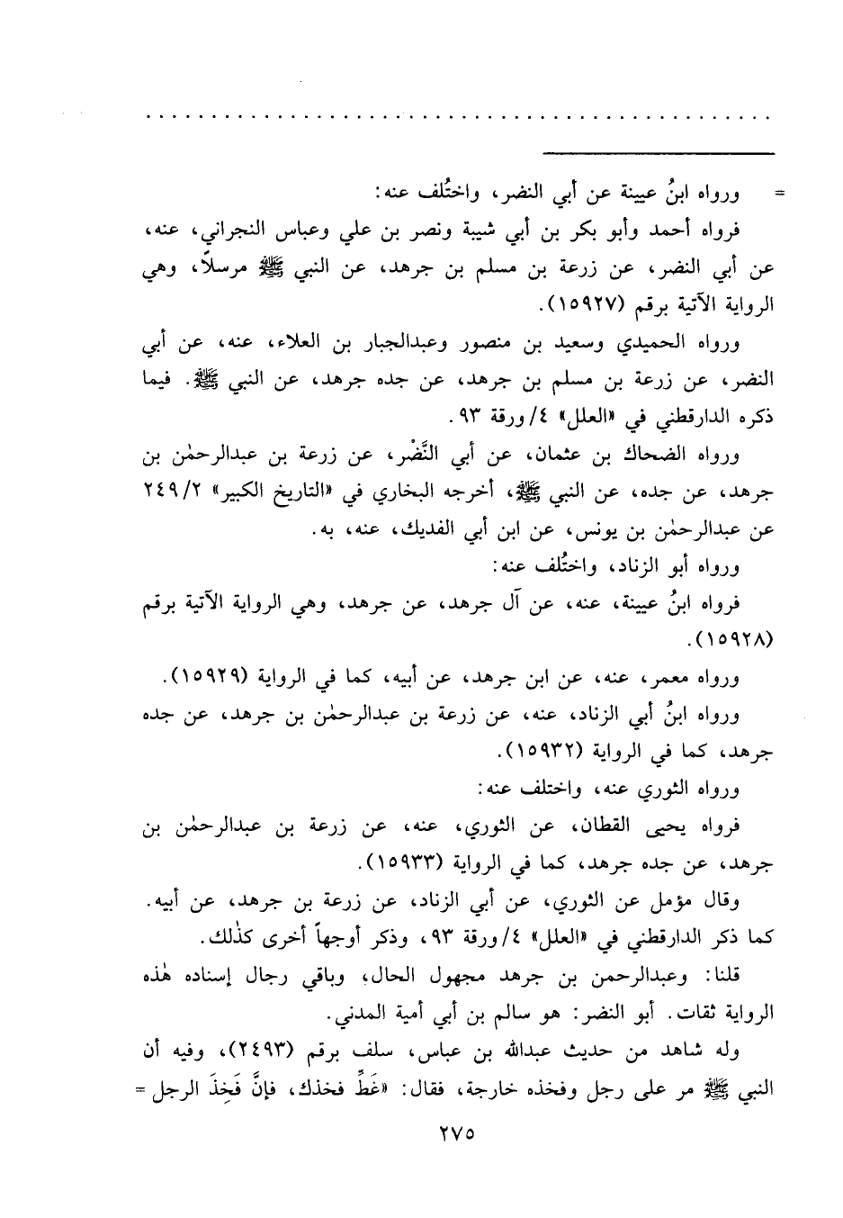 ورواه الحميدي وسعيد بن منصور وعبد الجبار بن العلاء، عنه، عن أبي النضر، عن زرعة بن مسلم بن جرهد، عن جده جرهد، عن النبي صَلَّى اللهُ عَلَيْهِ وَسَلَّمَ. فيما ذكره الدارقطني في "العلل" ٤/ورقة ٩٣.