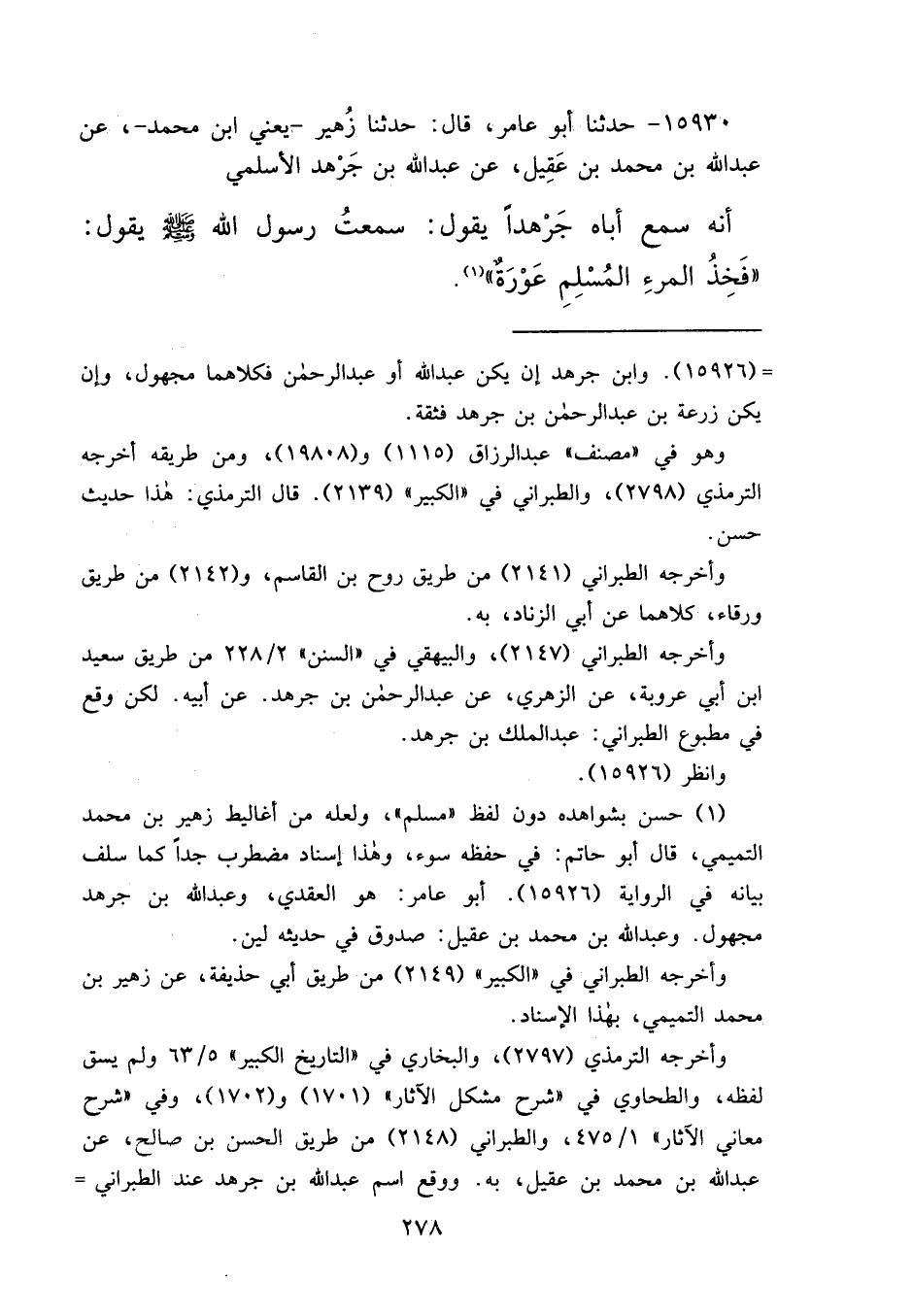 ١٥٩٣٠ - حَدَّثَنَا أَبُو عَامِرٍ، قَالَ: حَدَّثَنَا زُهَيْرٌ يَعْنِي ابْنَ مُحَمَّدٍ، عَنْ عَبْدِ اللهِ بْنِ مُحَمَّدِ بْنِ عَقِيلٍ، عَنْ عَبْدِ اللهِ بْنِ جَرْهَدٍ الْأَسْلَمِيِّ، أَنَّهُ سَمِعَ أَبَاهُ جَرْهَدًا، يَقُولُ: سَمِعْتُ رَسُولَ اللهِ صَلَّى اللهُ عَلَيْهِ وَسَلَّمَ يَقُولُ: " فَخِذُ الْمَرْءِ الْمُسْلِمِ عَوْرَةٌ " (١)