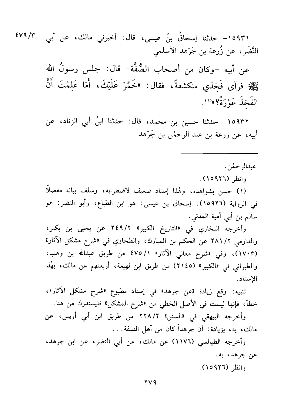 ١٥٩٣١ - حَدَّثَنَا إِسْحَاقُ بْنُ عِيسَى، قَالَ: أَخْبَرَنِي مَالِكٌ، عَنْ أَبِي النَّضْرِ، عَنْ زُرْعَةَ بْنِ جَرْهَدٍ الْأَسْلَمِيِّ، عَنْ أَبِيهِ، وَكَانَ مِنْ أَصْحَابِ الصُّفَّةِ، قَالَ: جَلَسَ رَسُولُ اللهِ صَلَّى اللهُ عَلَيْهِ وَسَلَّمَ، فَرَأَى فَخِذِي مُنْكَشِفَةً، فَقَالَ: " خَمِّرْ عَلَيْكَ أَمَا عَلِمْتَ أَنَّ الْفَخِذَ عَوْرَةٌ " (١)