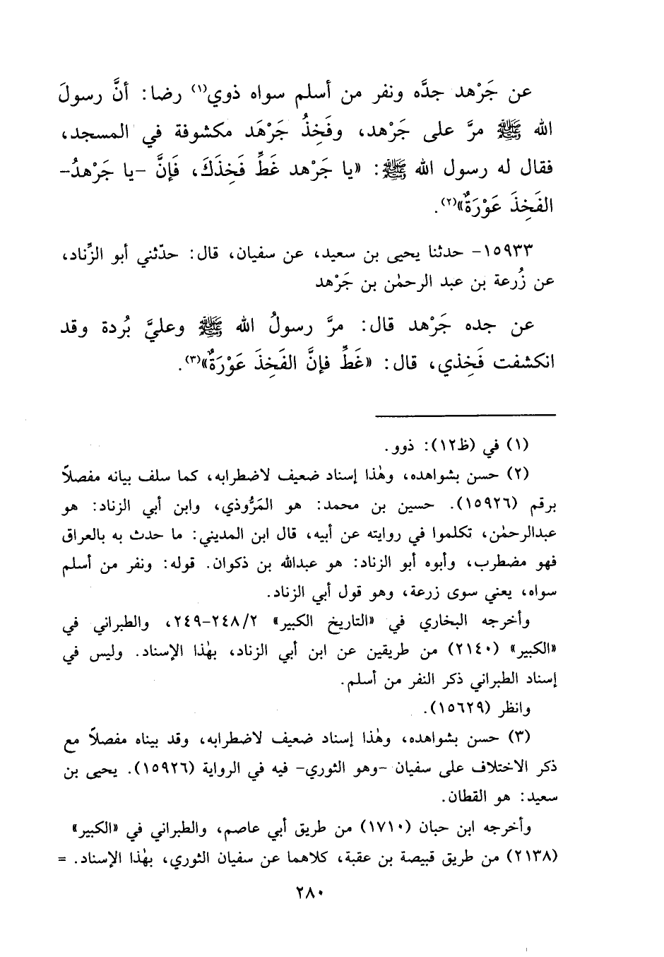 ١٥٩٣٣ - حَدَّثَنَا يَحْيَى بْنُ سَعِيدٍ، عَنْ سُفْيَانَ، قَالَ: حَدَّثَنِي أَبُو الزِّنَادِ، عَنْ زُرْعَةَ بْنِ عَبْدِ الرَّحْمَنِ بْنِ جَرْهَدٍ، عَنْ جَدِّهِ جَرْهَدٍ، قَالَ: مَرَّ رَسُولُ اللهِ صَلَّى اللهُ عَلَيْهِ وَسَلَّمَ وَعَلَيَّ بُرْدَةٌ، وَقَدِ انْكَشَفَتْ فَخِذِي قَالَ: " غَطِّ فَإِنَّ الْفَخْذَ عَوْرَةٌ " (٣)