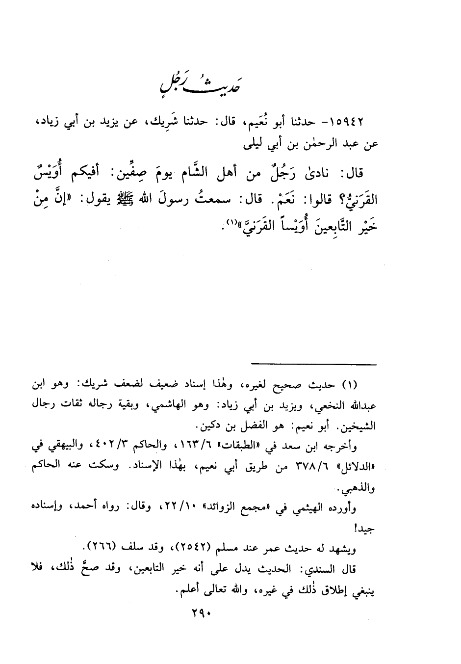 ١٥٩٤٢ - حَدَّثَنَا أَبُو نُعَيْمٍ، قَالَ: حَدَّثَنَا شَرِيكٌ، عَنْ يَزِيدَ بْنِ أَبِي زِيَادٍ، عَنْ عَبْدِ الرَّحْمَنِ بْنِ أَبِي لَيْلَى، قَالَ: نَادَى رَجُلٌ مِنْ أَهْلِ الشَّامِ يَوْمَ صِفِّينَ: أَفِيكُمْ أُوَيْسٌ الْقَرَنِيُّ؟ قَالُوا: نَعَمْ، قَالَ: سَمِعْتُ رَسُولَ اللهِ صَلَّى اللهُ عَلَيْهِ وَسَلَّمَ يَقُولُ: " إِنَّ مِنْ خَيْرِ التَّابِعِينَ أُوَيْسًا الْقَرَنِيَّ " (١)