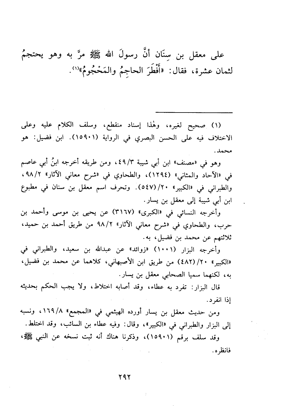عَنْ مَعْقِلِ بْنِ سِنَانٍ: أَنَّ رَسُولَ اللهِ صَلَّى اللهُ عَلَيْهِ وَسَلَّمَ مَرَّ بِهِ، وَهُوَ يَحْتَجِمُ لِثَمَانِ عَشْرَةَ، فقَالَ: " أَفْطَرَ الْحَاجِمُ وَالْمَحْجُومُ " (١)