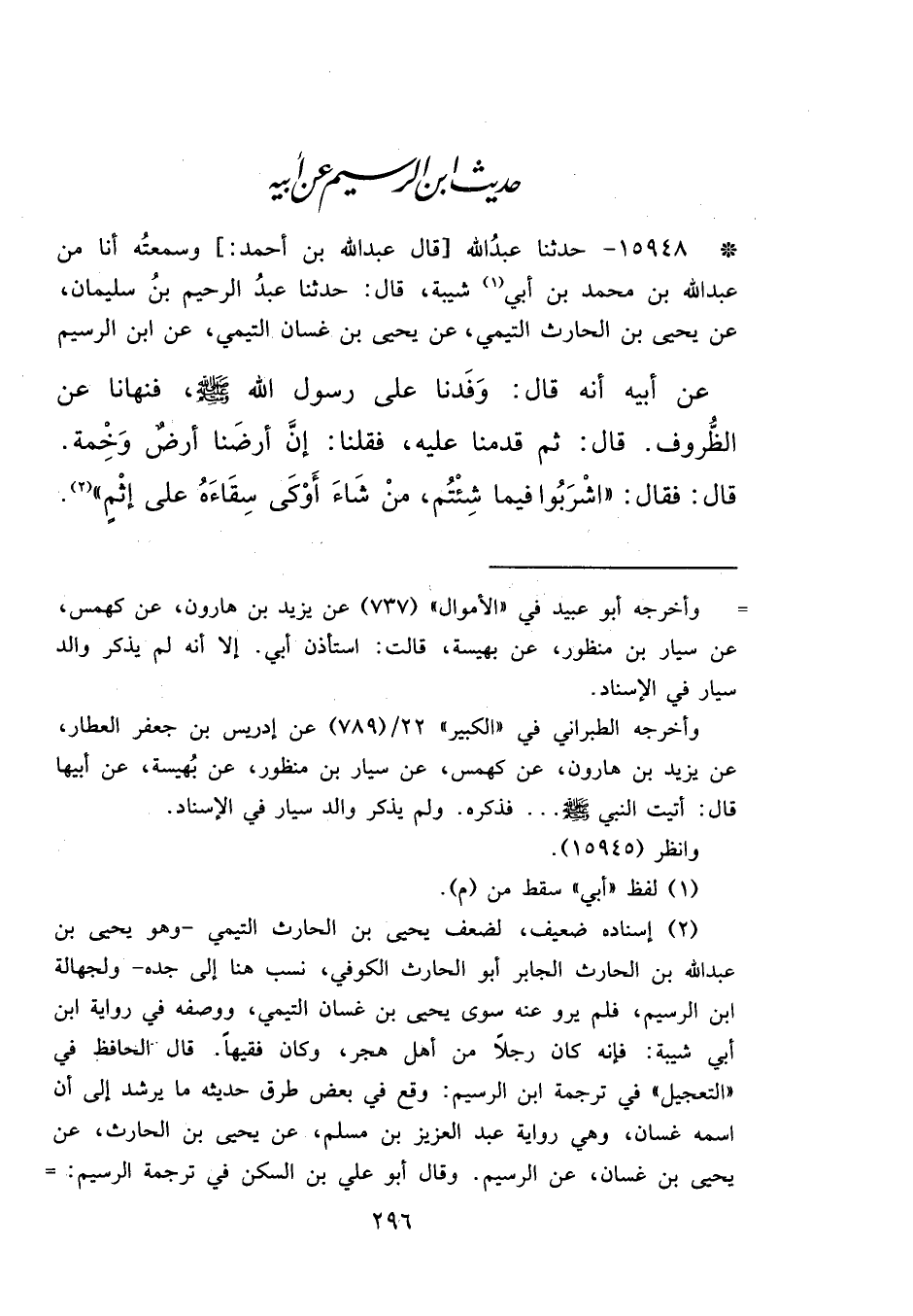 ١٥٩٤٨ - حَدَّثَنَا عَبْدُ اللهِ، [قَالَ عَبْدُ اللهِ بْنُ أَحْمَدَ] وَسَمِعْتُهُ أَنَا مِنْ عَبْدِ اللهِ بْنِ مُحَمَّدِ بْنِ أَبِي (١) شَيْبَةَ، قَالَ: حَدَّثَنَا عَبْدُ الرَّحِيمِ بْنُ سُلَيْمَانَ، عَنْ يَحْيَى بْنِ الْحَارِثِ التَّيْمِيِّ، عَنْ يَحْيَى بْنِ غَسَّانَ التَّيْمِيِّ، عَنِ ابْنِ الرَّسِيمِ، عَنْ أَبِيهِ، أَنَّهُ قَالَ: وفَدْنَا عَلَى رَسُولِ اللهِ صَلَّى اللهُ عَلَيْهِ وَسَلَّمَ فَنَهَانَا عَنِ الظُّرُوفِ قَالَ: ثُمَّ قَدِمْنَا عَلَيْهِ فَقُلْنَا: إِنَّ أَرْضَنَا أَرْضٌ وَخِمَةٌ، قَالَ: فَقَالَ: " اشْرَبُوا فِيمَا شِئْتُمْ مَنْ شَاءَ أَوْكَى سِقَاءَهُ، عَلَى إِثْمٍ " (٢)