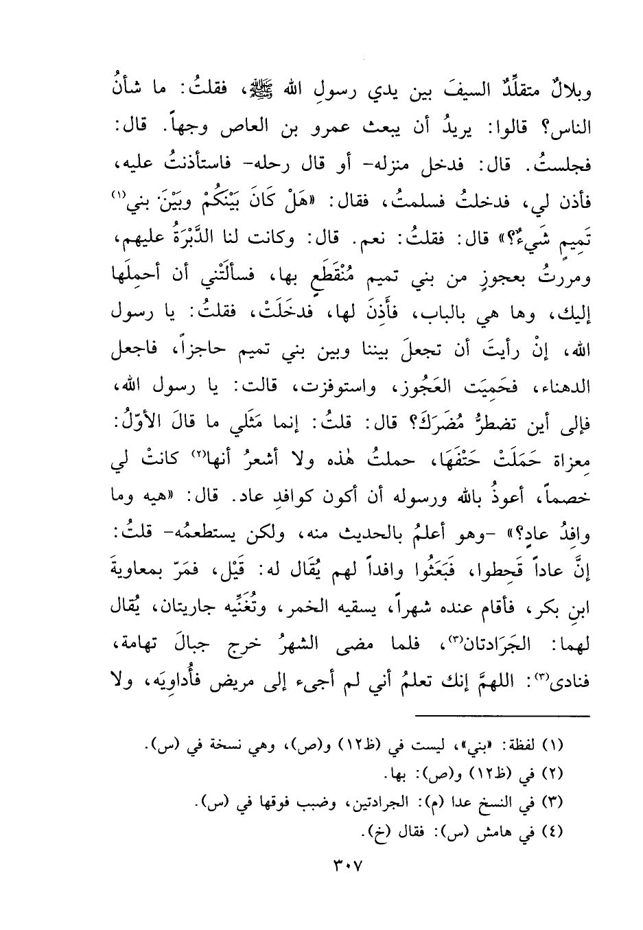 وَبِلَالٌ مُتَقَلِّدٌ السَّيْفَ بَيْنَ يَدَيْ رَسُولِ اللهِ صَلَّى اللهُ عَلَيْهِ وَسَلَّمَ فَقُلْتُ: مَا شَأْنُ النَّاسِ؟ قَالُوا: يُرِيدُ أَنْ يَبْعَثَ عَمْرَو بْنَ الْعَاصِ وَجْهًا، قَالَ: فَجَلَسْتُ، قَالَ: فَدَخَلَ مَنْزِلَهُ - أَوْ قَالَ: رَحْلَهُ - فَاسْتَأْذَنْتُ عَلَيْهِ، فَأَذِنَ لِي، فَدَخَلْتُ، فَسَلَّمْتُ فَقَالَ: " هَلْ كَانَ بَيْنَكُمْ وَبَيْنَ بَنِي (١) تَمِيمٍ شَيْءٌ؟ " قَالَ: فَقُلْتُ: نَعَمْ، قَالَ: وَكَانَتْ لَنَا الدَّبْرَةُ عَلَيْهِمْ، وَمَرَرْتُ بِعَجُوزٍ مِنْ بَنِي تَمِيمٍ مُنْقَطِعٌ بِهَا، فَسَأَلَتْنِي أَنْ أَحْمِلَهَا إِلَيْكَ، وَهَا هِيَ بِالْبَابِ فَأَذِنَ لَهَا فَدَخَلَتْ، فَقُلْتُ: يَا رَسُولَ اللهِ، إِنْ رَأَيْتَ أَنْ تَجْعَلَ بَيْنَنَا وَبَيْنَ بَنِي تَمِيمٍ حَاجِزًا، فَاجْعَلِ الدَّهْنَاءَ، فَحَمِيَتِ الْعَجُوزُ، وَاسْتَوْفَزَتْ، قَالَتْ: يَا رَسُولَ اللهِ، فَإِلَى أَيْنَ تَضْطَرُّ مُضَرَكَ؟ قَالَ: قُلْتُ: إِنَّمَا مَثَلِي، مَا قَالَ الْأَوَّلُ: مِعْزَاةُ حَمَلَتْ حَتْفَهَا، حَمَلْتُ هَذِهِ، وَلَا أَشْعُرُ أَنَّهَا (٢) كَانَتْ لِي خَصْمًا أَعُوذُ بِاللهِ، وَرَسُولِهِ أَنْ أَكُونَ كَوَافِدِ عَادٍ قَالَ: " هِيهْ، وَمَا وَافِدُ عَادٍ؟ " وَهُوَ أَعْلَمُ بِالْحَدِيثِ مِنْهُ، وَلَكِنْ يَسْتَطْعِمُهُ، قُلْتُ: إِنَّ عَادًا قَحَطُوا فَبَعَثُوا وَافِدًا لَهُمْ، يُقَالُ لَهُ: قَيْلٌ، فَمَرَّ بِمُعَاوِيَةَ بْنِ بَكْرٍ، فَأَقَامَ عِنْدَهُ شَهْرًا يَسْقِيهِ الْخَمْرَ، وَتُغَنِّيهِ جَارِيَتَانِ يُقَالُ لَهُمَا: الْجَرَادَتَانِ (٣) ، فَلَمَّا مَضَى الشَّهْرُ خَرَجَ جِبَالَ تِهَامَةَ، فَنَادَى (٤) : اللهُمَّ إِنَّكَ تَعْلَمُ أَنِّي لَمْ أَجِئْ إِلَى مَرِيضٍ فَأُدَاوِيَهُ، وَلَا