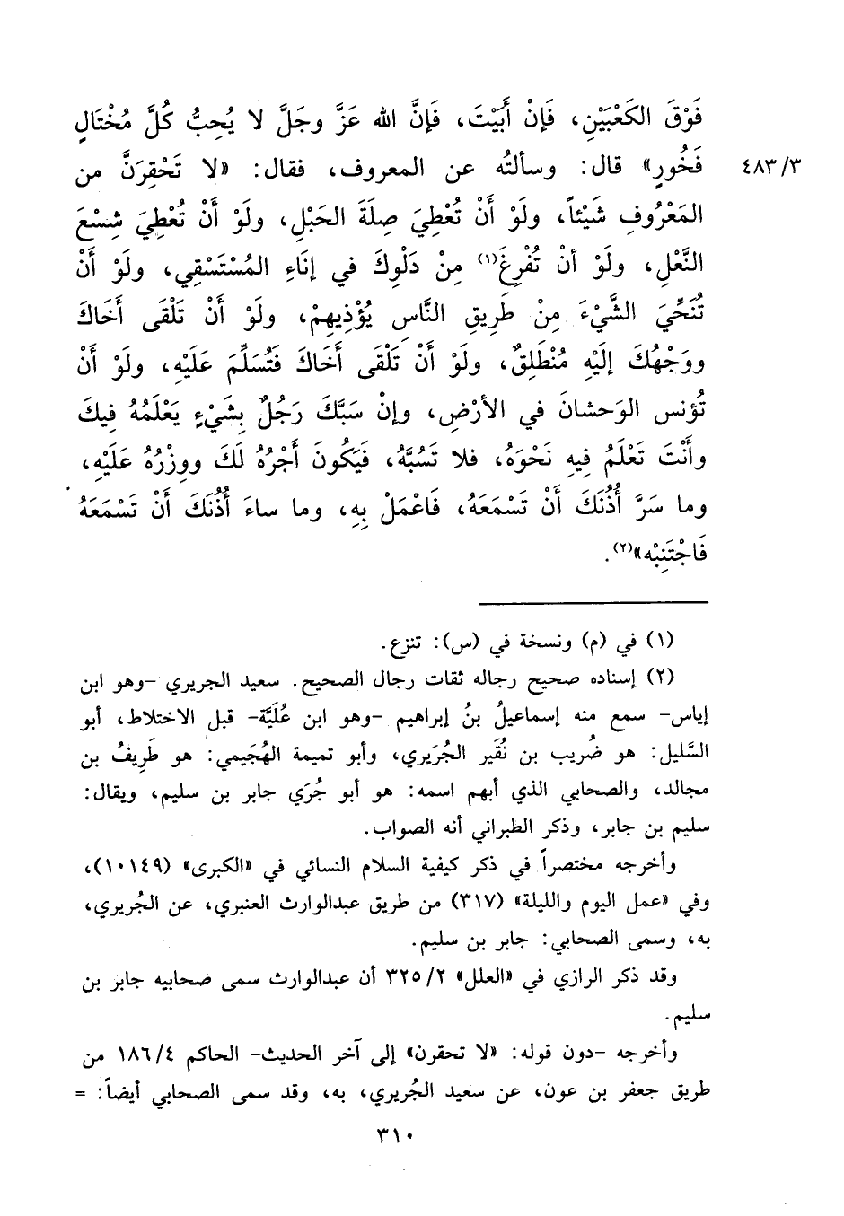 (٢) إسناده صحيح رجاله ثقات رجال الصحيح. سعيد الجريري- وهو ابن إياس- سمع منه إسماعيلُ بنُ إبراهيم- وهو ابن عُلَيَّة- قبل الاختلاط، أبو السَّليل: هو ضُريب بن نُقَير الجُرَيري، وأبو تميمة الهُجَيمي: هو طَرِيفُ بن مجالد، والصحابي الذي أبهم اسمه: هو أبو جُرَي جابر بن سليم، ويقال: سليم بن جابر، وذكر الطبراني أنه الصواب.