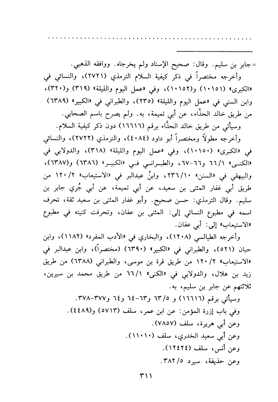 وأخرجه الطيالسي (١٢٠٨) ، والبخاري في "الأدب المفرد"، (١١٨٢) ، وابن حبان (٥٢١) ، والطبراني في "الكبير" (٦٣٩٠) (مختصراً) ، وابن عبد البر في "الاستيعاب" ٢/١٢٠ من طريق قرة بن موسى، والطبراني (٦٣٨٨) من طريق زيد بن هلال، والدولابي في "الكنى" ١/٦٦ من طريق محمد بن سيرين، ثلاثتهم عن جابر بن سليم، به.