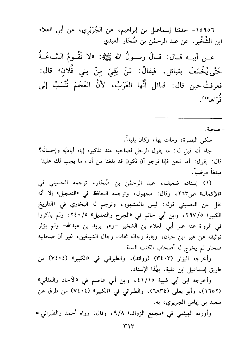١٥٩٥٦ - حَدَّثَنَا إِسْمَاعِيلُ بْنُ إِبْرَاهِيمَ، عَنِ الْجُرَيْرِيِّ، عَنْ أَبِي الْعَلَاءِ بْنِ الشِّخِّيرِ، عَنْ عَبْدِ الرَّحْمَنِ بْنِ صُحَارٍ الْعَبْدِيِّ، عَنْ أَبِيهِ قَالَ: قَالَ رَسُولُ اللهِ صَلَّى اللهُ عَلَيْهِ وَسَلَّمَ: " لَا تَقُومُ السَّاعَةُ حَتَّى يُخْسَفَ بِقَبَائِلَ، فَيُقَالُ: مَنْ بَقِيَ مِنْ بَنِي فُلَانٍ "، قَالَ: فَعَرَفْتُ حِينَ قَالَ: قَبَائِلَ أَنَّهَا الْعَرَبُ، لِأَنَّ الْعَجَمَ تُنْسَبُ إِلَى قُرَاهَا (١)