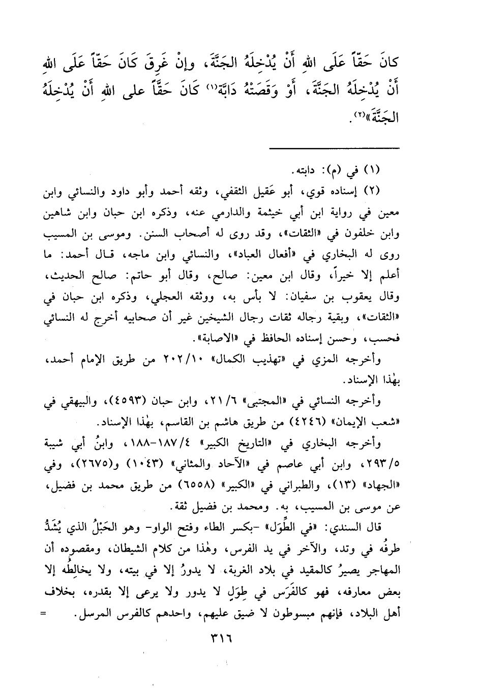 كَانَ حَقًّا عَلَى اللهِ أَنْ يُدْخِلَهُ الْجَنَّةَ، وَإِنْ غَرِقَ كَانَ حَقًّا عَلَى اللهِ أَنْ يُدْخِلَهُ الْجَنَّةَ، أَوْ وَقَصَتْهُ دَابَّةٌُ (١) كَانَ حَقًّا عَلَى اللهِ أَنْ يُدْخِلَهُ الْجَنَّةَ " (٢)