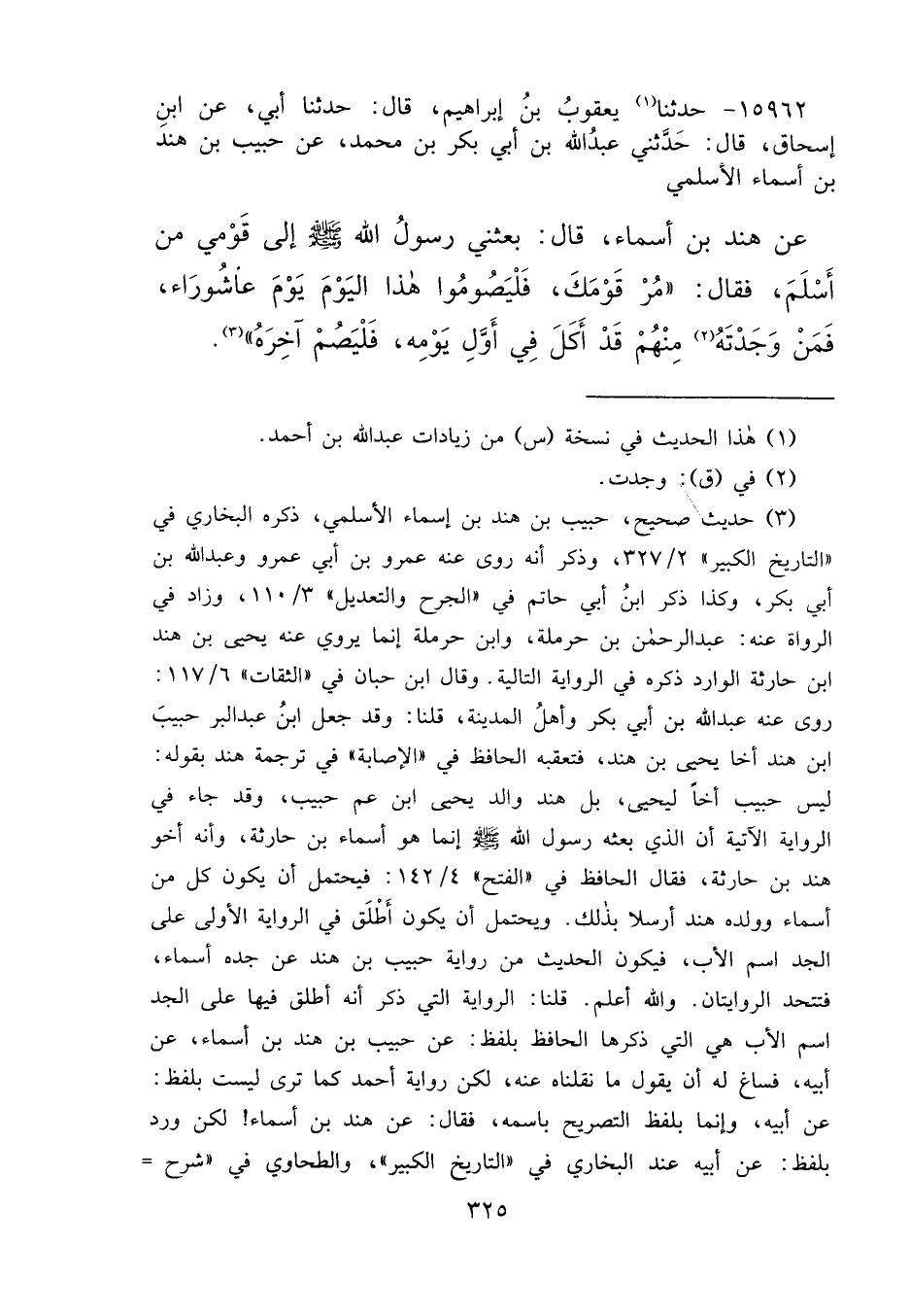١٥٩٦٢ - حَدَّثَنَا (١) يَعْقُوبُ بْنُ إِبْرَاهِيمَ، قَالَ: حَدَّثَنَا أَبِي، عَنِ ابْنِ إِسْحَاقَ، قَالَ: حَدَّثَنِي عَبْدُ اللهِ بْنُ أَبِي بَكْرِ بْنِ مُحَمَّدٍ، عَنْ حَبِيبِ بْنِ هِنْدِ بْنِ أَسْمَاءَ الْأَسْلَمِيِّ، عَنْ هِنْدِ بْنِ أَسْمَاءَ، قَالَ: بَعَثَنِي رَسُولُ اللهِ صَلَّى اللهُ عَلَيْهِ وَسَلَّمَ إِلَى قَوْمِي مِنْ أَسْلَمَ فَقَالَ: " مُرْ قَوْمَكَ فَلْيَصُومُوا هَذَا الْيَوْمَ يَوْمَ عَاشُورَاءَ فَمَنْ وَجَدْتَهُ (٢) مِنْهُمْ قَدْ أَكَلَ فِي أَوَّلِ يَوْمِهِ فَلْيَصُمْ آخِرَهُ " (٣)