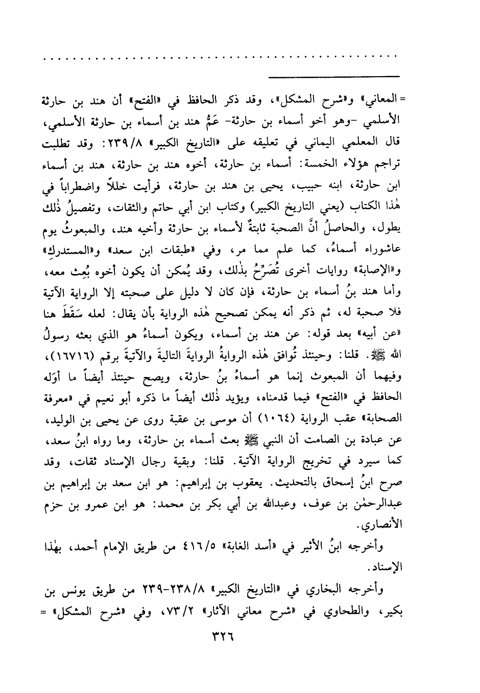 = المعاني" و"شرح المشكل"، وقد ذكر الحافظ في "الفتح" أن هند بن حارثة الأسلمي- وهو أخو أسماء بن حارثة- عَمُّ هند بن أسماء بن حارثة الأسلمي، قال المعلمي اليماني في تعليقه على "التاريخ الكبير" ٨/٢٣٩: وقد تطلبت تراجم هؤلاء الخمسة: أسماء بن حارثة، أخوه هند بن حارثة، هند بن أسماء ابن حارثة، ابنه حبيب، يحيى بن هند بن حارثة، فرأيت خللاً واضطراباً في هذا الكتاب (يعني التاريخ الكبير) وكتاب ابن أبي حاتم والثقات، وتفصيلُ ذلك يطول، والحاصلُ أنَّ الصحبة ثابتةٌ لأسماء بن حارثة وأخيه هند، والمبعوثُ يوم عاشوراء أسماءُ، كما علم مما مر، وفي "طبقات ابن سعد" و"المستدركِ" و"الإصابة" روايات أخرى تُصَرِّحُ بذلك، وقد يُمكن أن يكون أخوه بُعِث معه، وأما هند بنُ أسماء بن حارثة، فإن كان لا دليل على صحبته إلا الرواية الآتية فلا صحبة له، ثم ذكر أنه يمكن تصحيح هذه الرواية بأن يقال: لعله سَقَطَ هنا "عن أبيه" بعد قوله: عن هند بن أسماء، ويكون أسماءُ هو الذي بعثه رسولُ الله صَلَّى اللهُ عَلَيْهِ وَسَلَّمَ. قلنا: وحينئذ تُوافق هذه الروايةُ الروايةَ التاليةَ والآتيةَ برقم (١٦٧١٦) ، وفيهما أن المبعوث إنما هو أسماءُ بنُ حارثة، ويصح حينئذ أيضاً ما أوَله الحافظ في "الفتح" فيما قدمناه، ويؤيد ذلك أيضاً ما ذكره أبو نعيم في "معرفة الصحابة" عقب الرواية (١٠٦٤) أن موسى بن عقبة روى عن يحيى بن الوليد، عن عبادة بن الصامت أن النبي صَلَّى اللهُ عَلَيْهِ وَسَلَّمَ بعث أسماء بن حارثة، وما رواه ابنُ سعد، كما سيرد في تخريج الرواية الآتية. قلنا: وبقية رجال الإسناد ثقات، وقد صرح ابنُ إسحاق بالتحديث. يعقوب بن إبراهيم: هو ابن سعد بن إبراهيم بن عبد الرحمن بن عوف، وعبد الله بن أبي بكر بن محمد: هو ابن عمرو بن حزم