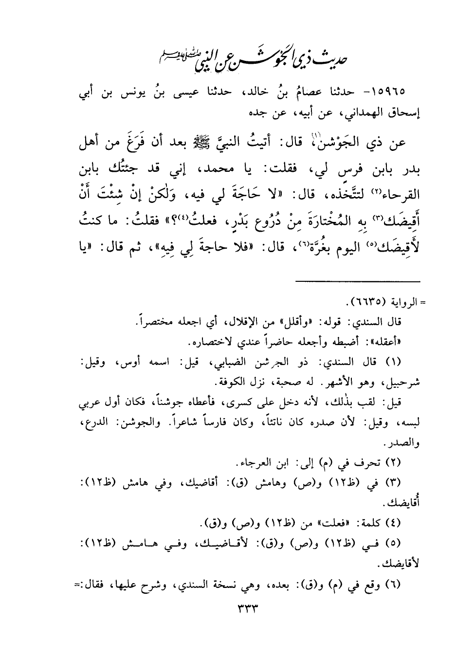 ١٥٩٦٥ - حَدَّثَنَا عِصَامُ بْنُ خَالِدٍ، حَدَّثَنَا عِيسَى بْنُ يُونُسَ بْنِ أَبِي إِسْحَاقَ الْهَمْدَانِيُّ، عَنْ أَبِيهِ، عَنْ جَدِّهِ، عَنْ ذِي الْجَوْشَنِ (١) ، قَالَ: أَتَيْتُ النَّبِيَّ صَلَّى اللهُ عَلَيْهِ وَسَلَّمَ بَعْدَ أَنْ فَرَغَ مِنْ أَهْلِ بَدْرٍ بِابْنِ فَرَسٍ لِي، فَقُلْتُ: يَا مُحَمَّدُ إِنِّي قَدْ جِئْتُكَ بِابْنِ الْقَرْحَاءِ (٢) لِتَتَّخِذَهُ، قَالَ: " لَا حَاجَةَ لِي فِيهِ، وَلَكِنْ إِنْ شِئْتَ أَنْ أَقِيضَكَ (٣) بِهِ الْمُخْتَارَةَ مِنْ دُرُوعِ بَدْرٍ فَعَلْتُ (٤) " فَقلْتُ: مَا كُنْتُ لِأَقِيضَكَ (٥) الْيَوْمَ بِغُرَّةٍ (٦) قَالَ: " فَلَا حَاجَةَ لِي فِيهِ " ثُمَّ قَالَ: " يَا