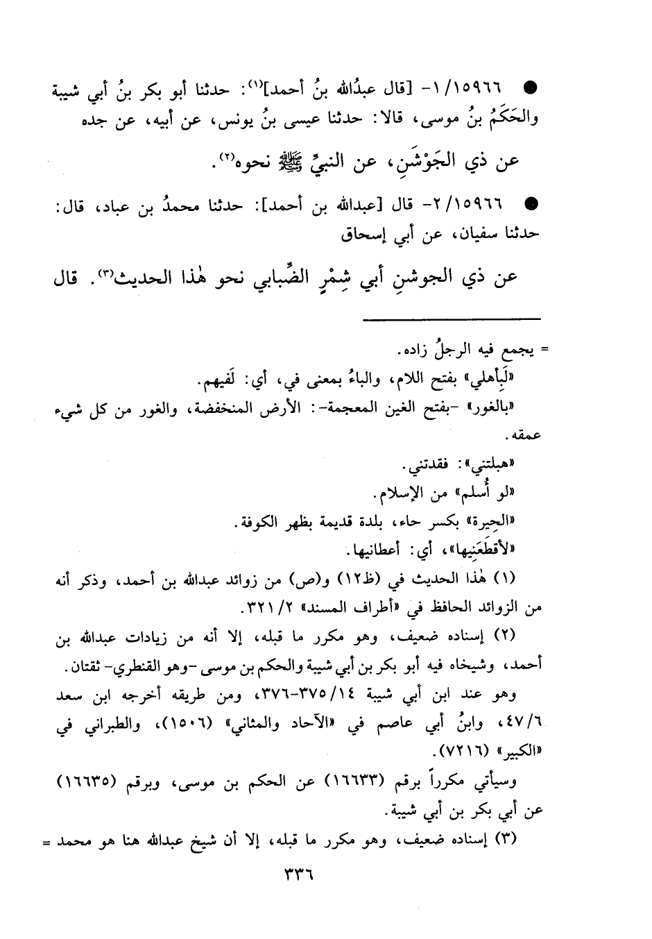 • ١٥٩٦٦/١ -[قَالَ عَبْدُ اللهِ بْنُ أَحْمَدَ] (١) ، حَدَّثَنَا أَبُو بَكْرِ بْنُ أَبِي شَيْبَةَ، وَالْحَكَمُ بْنُ مُوسَى، قَالَا: حَدَّثَنَا عِيسَى بْنُ يُونُسَ، عَنْ أَبِيهِ، عَنْ جَدِّهِ، عَنْ ذِي الْجَوْشَنِ، عَنِ النَّبِيِّ صَلَّى اللهُ عَلَيْهِ وَسَلَّمَ نَحْوَهُ (٢) ،