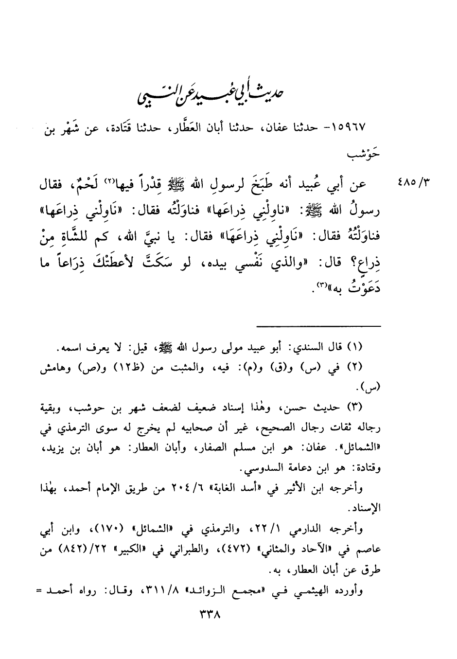 ١٥٩٦٧ - حَدَّثَنَا عَفَّانُ، حَدَّثَنَا أَبَانُ الْعَطَّارُ، حَدَّثَنَا قَتَادَةُ، عَنْ شَهْرِ بْنِ حَوْشَبٍ، عَنْ أَبِي عُبَيْدٍ، أَنَّهُ طَبَخَ لِرَسُولِ اللهِ صَلَّى اللهُ عَلَيْهِ وَسَلَّمَ قِدْرًا فِيهَا (٢) لَحْمٌ، فَقَالَ رَسُولُ اللهِ صَلَّى اللهُ عَلَيْهِ وَسَلَّمَ: " نَاوِلْنِي ذِرَاعَهَا " فَنَاوَلْتُهُ فَقَالَ: " نَاوِلْنِي ذِرَاعَهَا " فَنَاوَلْتُهُ فَقَالَ: " نَاوِلْنِي ذِرَاعَهَا " فَقَالَ: يَا نَبِيَّ اللهِ كَمْ لِلشَّاةِ مِنْ ذِرَاعٍ؟ قَالَ: " وَالَّذِي نَفْسِي بِيَدِهِ، لَوْ سَكَتَّ لَأَعْطَتْكَ ذِرَاعًا مَا دَعَوْتَ بِهِ " (٣)
