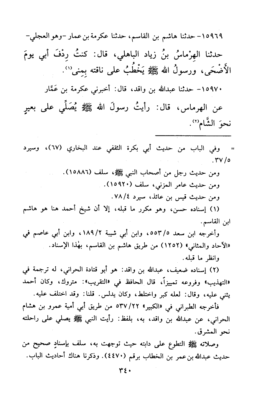 ١٥٩٧٠ - حَدَّثَنَا عَبْدُ اللهِ بْنُ وَاقِدٍ، قَالَ: أَخْبَرَنِي عِكْرِمَةُ بْنُ عَمَّارٍ، عَنِ الْهِرْمَاسِ، قَالَ: " رَأَيْتُ رَسُولَ اللهِ صَلَّى اللهُ عَلَيْهِ وَسَلَّمَ يُصَلِّي عَلَى بَعِيرٍ نَحْوَ الشَّامِ " (٢)