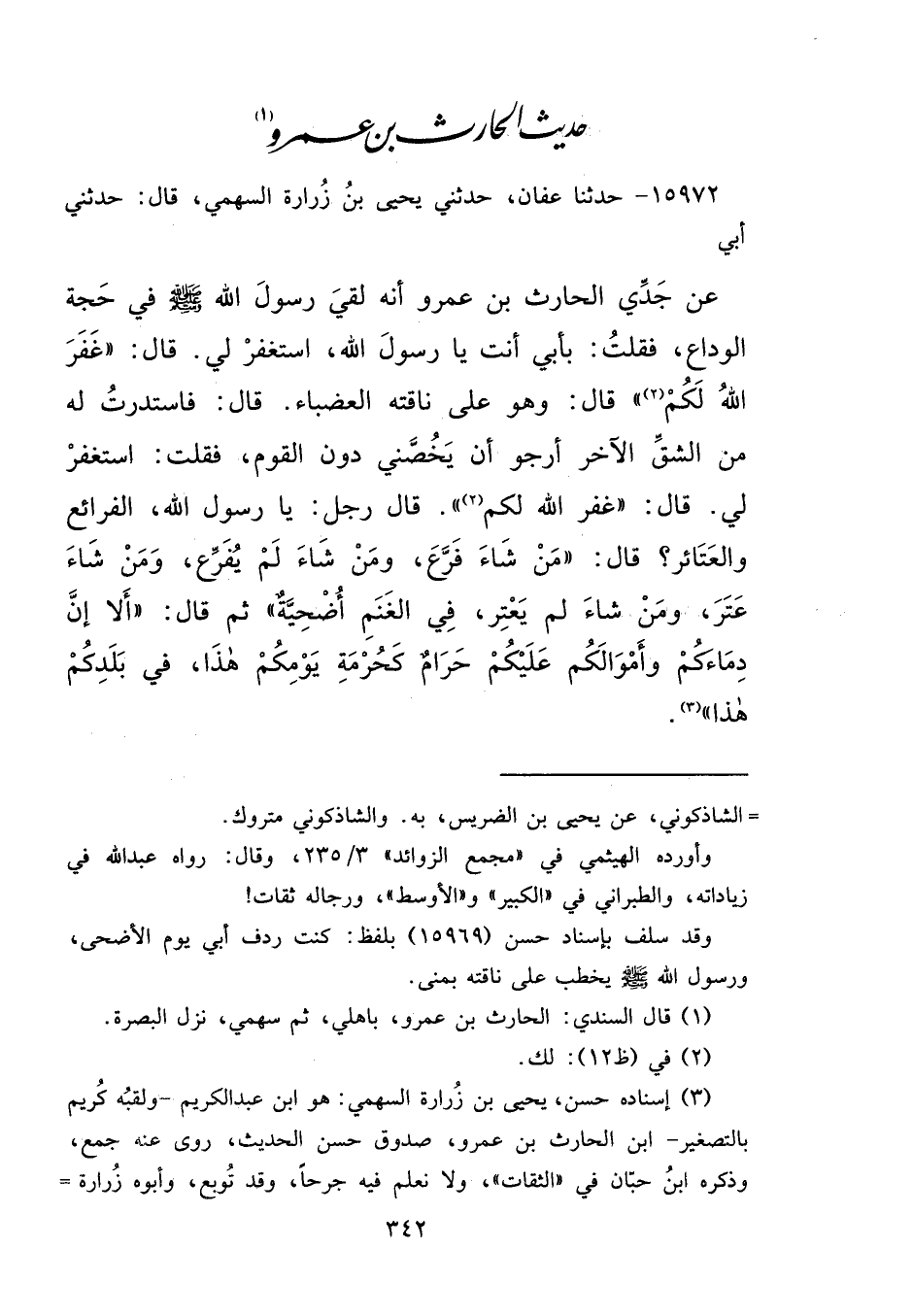 ١٥٩٧٢ - حَدَّثَنَا عَفَّانُ، حَدَّثَنِي يَحْيَى بْنُ زُرَارَةَ السَّهْمِيُّ، قَالَ: حَدَّثَنِي أَبِي، عَنْ جَدِّي الْحَارِثِ بْنِ عَمْرٍو، أَنَّهُ لَقِيَ رَسُولَ اللهِ صَلَّى اللهُ عَلَيْهِ وَسَلَّمَ فِي حَجَّةِ الْوَدَاعِ، فَقُلْتُ: بِأَبِي أَنْتَ يَا رَسُولَ اللهِ، اسْتَغْفِرْ لِي، قَالَ: " غَفَرَ اللهُ لَكُمْ (٢) " قَالَ: وَهُوَ عَلَى نَاقَتِهِ الْعَضْبَاءِ، قَالَ: فَاسْتَدَرْتُ لَهُ مِنَ الشِّقِّ الْآخَرِ، أَرْجُو أَنْ يَخُصَّنِي دُونَ الْقَوْمِ، فَقُلْتُ: اسْتَغْفِرْ لِي قَالَ: " غَفَرَ اللهُ لَكُمْ " قَالَ رَجُلٌ: يَا رَسُولَ اللهِ الْفَرَائِعُ وَالْعَتَائِرُ، قَالَ: " مَنْ شَاءَ فَرَّعَ، وَمَنْ شَاءَ لَمْ يُفَرِّعْ، وَمَنْ شَاءَ عَتَرَ، وَمَنْ شَاءَ لَمْ يَعْتِرْ فِي الْغَنَمِ أُضْحِيَّةٌ " ثُمَّ قَالَ: " أَلَا إِنَّ دِمَاءَكُمْ، وَأَمْوَالَكُمْ عَلَيْكُمْ حَرَامٌ، كَحُرْمَةِ يَوْمِكُمْ هَذَا، فِي بَلَدِكُمْ هَذَا " (٣)