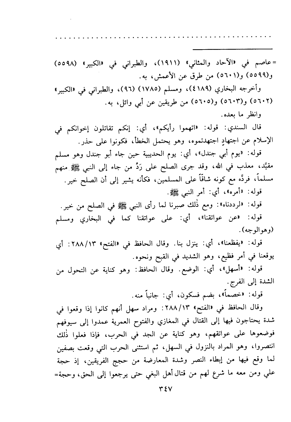وقال الحافظ في "الفتح" ١٣/٢٨٨: ومراد سهل أنهم كانوا إذا وقعوا في شدة يحتاجون فيها إلى القتال في المغازي والفتوح العمرية عمدوا إلى سيوفهم فوضعوها على عواتقهم، وهو كناية عن الجد في الحرب، فإذا فعلوا ذلك انتصروا، وهو المراد بالنزول في السهل، ثم استثنى الحرب التي وقعت بصفين لما وقع فيها من إبطاء النصر وشدة المعارضة من حجج الفريقين، إذ حجة علي ومن معه ما شرع لهم من قتال أهل البغي حتى يرجعوا إلى الحق، وحجة=