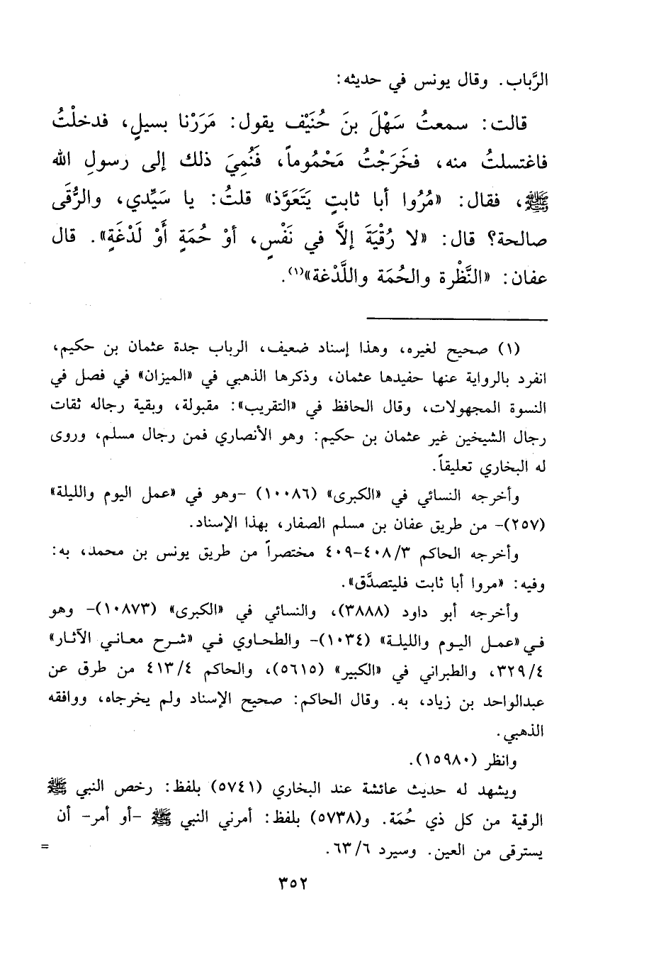 الرَّبَابُ، وَقَالَ يُونُسُ فِي حَدِيثِهِ: قَالَتْ: سَمِعْتُ سَهْلَ بْنَ حُنَيْفٍ يَقُولُ: مَرَرْنَا بِسَيْلٍ فَدَخَلْتُ فَاغْتَسَلْتُ مِنْهُ، فَخَرَجْتُ مَحْمُومًا، فَنُمِيَ ذَلِكَ إِلَى رَسُولِ اللهِ صَلَّى اللهُ عَلَيْهِ وَسَلَّمَ، فَقَالَ: " مُرُوا أَبَا ثَابِتٍ يَتَعَوَّذُ "، قُلْتُ: يَا سَيِّدِي وَالرُّقَى صَالِحَةٌ؟ قَالَ: " لَا رُقْيَةَ إِلَّا فِي نَفْسٍ، أَوْ حُمَةٍ، أَوْ لَدْغَةٍ " قَالَ عَفَّانُ: " النَّظْرَةُ،، وَالْحُمَةُ وَاللَّدْغَةُ " (١)