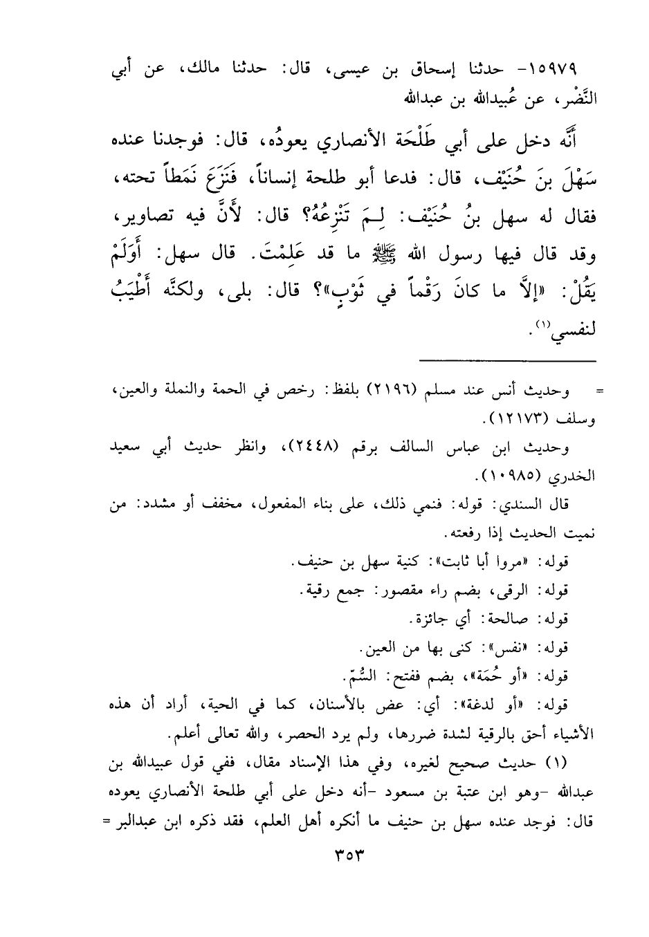 ١٥٩٧٩ - حَدَّثَنَا إِسْحَاقُ بْنُ عِيسَى، قَالَ: حَدَّثَنَا مَالِكٌ، عَنْ أَبِي النَّضْرِ، عَنْ عُبَيْدِ اللهِ بْنِ عَبْدِ اللهِ، أَنَّهُ دَخَلَ عَلَى أَبِي طَلْحَةَ الْأَنْصَارِيِّ يَعُودُهُ، قَالَ: فَوَجَدْنَا عِنْدَهُ سَهْلَ بْنَ حُنَيْفٍ، قَالَ: فَدَعَا أَبُو طَلْحَةَ إِنْسَانًا فَنَزَعَ نَمَطًا تَحْتَهُ، فَقَالَ لَهُ سَهْلُ بْنُ حُنَيْفٍ: لِمَ تَنْزِعُهُ؟ قَالَ: لِأَنَّ فِيهِ تَصَاوِيرَ، وَقَدْ قَالَ فِيهَا رَسُولُ اللهِ صَلَّى اللهُ عَلَيْهِ وَسَلَّمَ مَا قَدْ عَلِمْتَ، قَالَ سَهْلٌ: أَوَلَمْ يَقُلْ: " إِلَّا مَا كَانَ رَقْمًا فِي ثَوْبٍ " قَالَ: بَلَى وَلَكِنَّهُ أَطْيَبُ لِنَفْسِي (١)