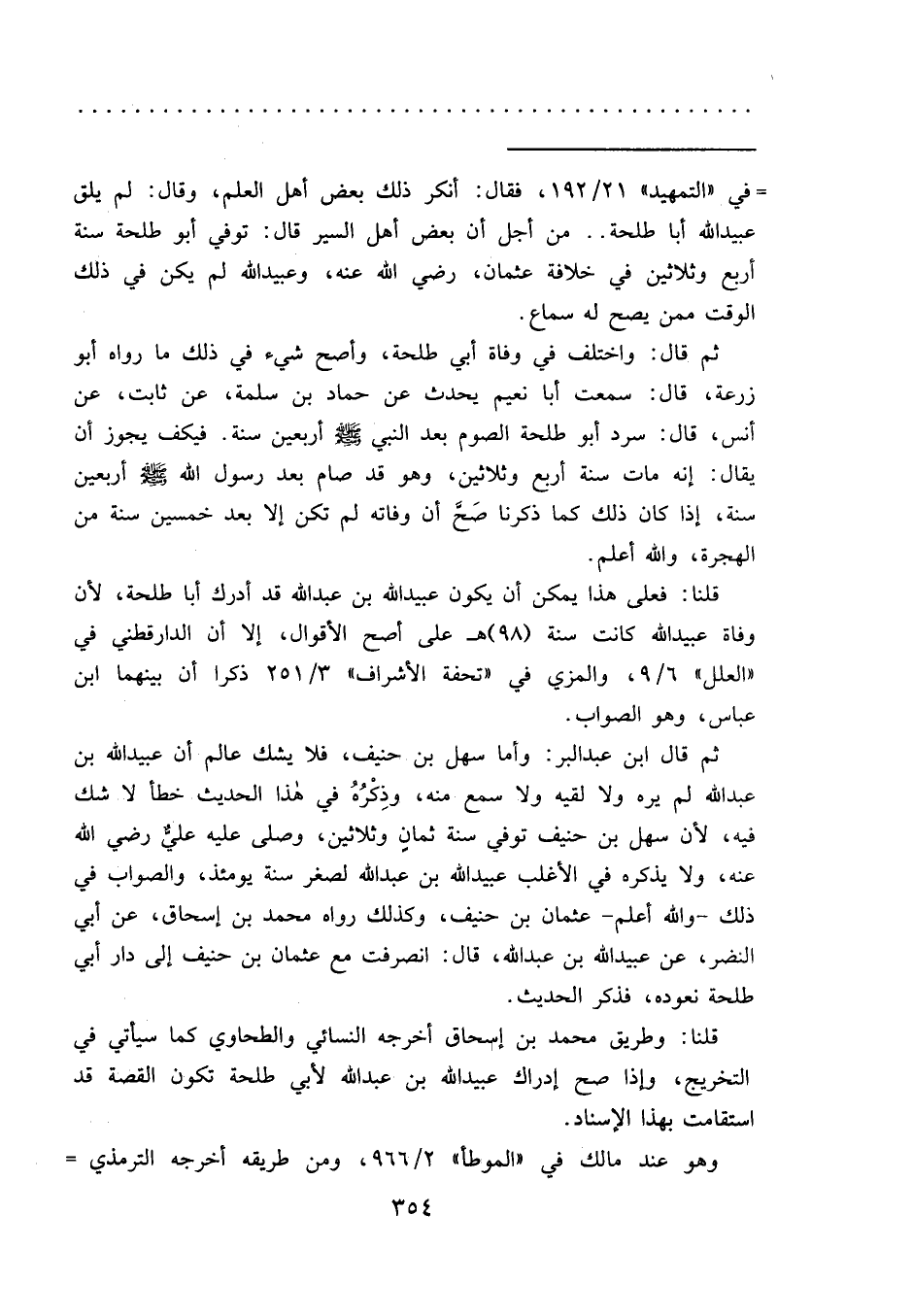 = في "التمهيد" ٢١/١٩٢، فقال: أنكر ذلك بعض أهل العلم، وقال: لم يلق عبيد الله أبا طلحة.. من أجل أن بعض أهل السير قال: توفي أبو طلحة سنة أربع وثلاثين في خلافة عثمان، رضي الله عنه، وعبيد الله لم يكن في ذلك الوقت ممن يصح له سماع.