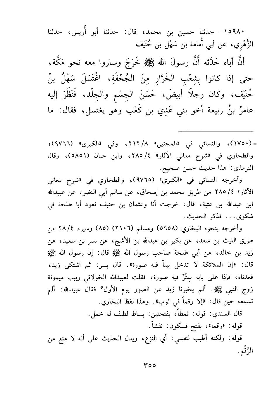 ١٥٩٨٠ - حَدَّثَنَا حُسَيْنُ بْنُ مُحَمَّدٍ، قَالَ: حَدَّثَنَا أَبُو أُوَيْسٍ، حَدَّثَنَا الزُّهْرِيُّ، عَنْ أَبِي أُمَامَةَ بْنِ سَهْلِ بْنِ حُنَيْفٍ، أَنَّ أَبَاهُ حَدَّثَهُ: أَنَّ رَسُولَ اللهِ صَلَّى اللهُ عَلَيْهِ وَسَلَّمَ خَرَجَ، وَسَارُوا مَعَهُ نَحْوَ مَكَّةَ، حَتَّى إِذَا كَانُوا بِشِعْبِ الْخَزَّارِ مِنَ الْجُحْفَةِ، اغْتَسَلَ سَهْلُ بْنُ حُنَيْفٍ وَكَانَ رَجُلًا أَبْيَضَ، حَسَنَ الْجِسْمِ، وَالْجِلْدِ، فَنَظَرَ إِلَيْهِ عَامِرُ بْنُ رَبِيعَةَ أَخُو بَنِي عَدِيِّ بْنِ كَعْبٍ وَهُوَ يَغْتَسِلُ، فَقَالَ: مَا