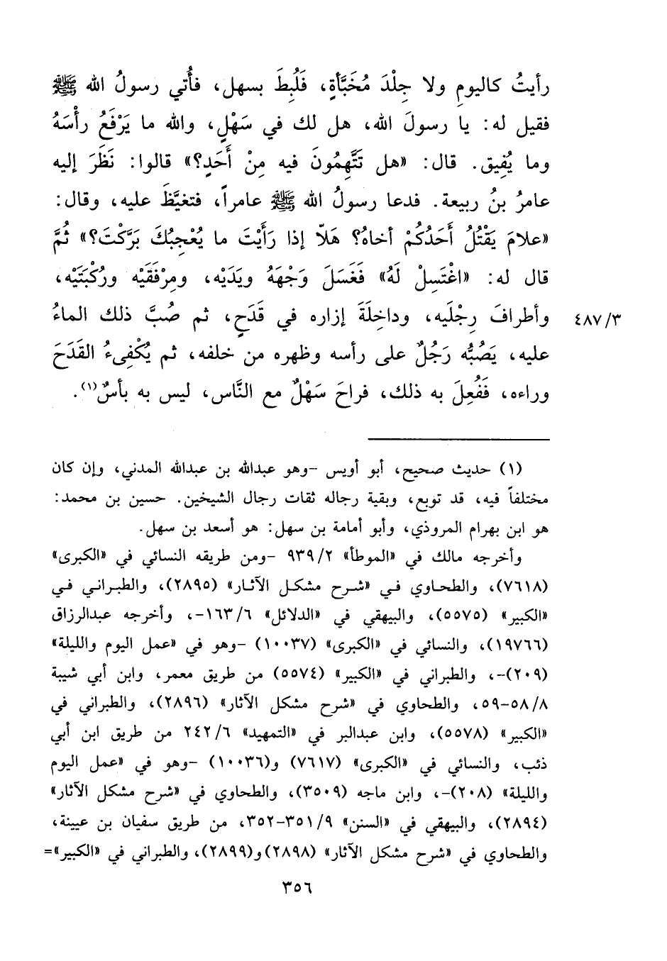 رَأَيْتُ كَالْيَوْمِ، وَلَا جِلْدَ مُخَبَّأَةٍ فَلُبِطَ بِسَهْلٌ، فَأُتِيَ رَسُولُ اللهِ صَلَّى اللهُ عَلَيْهِ وَسَلَّمَ، فَقِيلَ لَهُ: يَا رَسُولَ اللهِ، هَلْ لَكَ فِي سَهْلٍ؟ وَاللهِ مَا يَرْفَعُ رَأْسَهُ، وَمَا يُفِيقُ، قَالَ: " هَلْ تَتَّهِمُونَ فِيهِ مِنْ أَحَدٍ؟ " قَالُوا: نَظَرَ إِلَيْهِ عَامِرُ بْنُ رَبِيعَةَ فَدَعَا رَسُولُ اللهِ صَلَّى اللهُ عَلَيْهِ وَسَلَّمَ عَامِرًا، فَتَغَيَّظَ عَلَيْهِ وَقَالَ: " عَلَامَ يَقْتُلُ أَحَدُكُمْ أَخَاهُ؟ هَلَّا إِذَا رَأَيْتَ مَا يُعْجِبُكَ بَرَّكْتَ؟ " ثُمَّ قَالَ لَهُ: " اغْتَسِلْ لَهُ " فَغَسَلَ وَجْهَهُ، وَيَدَيْهِ، وَمِرْفَقَيْهِ، وَرُكْبَتَيْهِ، وَأَطْرَافَ رِجْلَيْهِ، وَدَاخِلَةَ إِزَارِهِ فِي قَدَحٍ، ثُمَّ صُبَّ ذَلِكَ الْمَاءُ عَلَيْهِ، يَصُبُّهُ رَجُلٌ عَلَى رَأْسِهِ، وَظَهْرِهِ مِنْ خَلْفِهِ، يُكْفِئُ الْقَدَحَ وَرَاءَهُ، فَفَعَلَ بِهِ ذَلِكَ، فَرَاحَ سَهْلٌ مَعَ النَّاسِ لَيْسَ بِهِ بَأْسٌ (١)