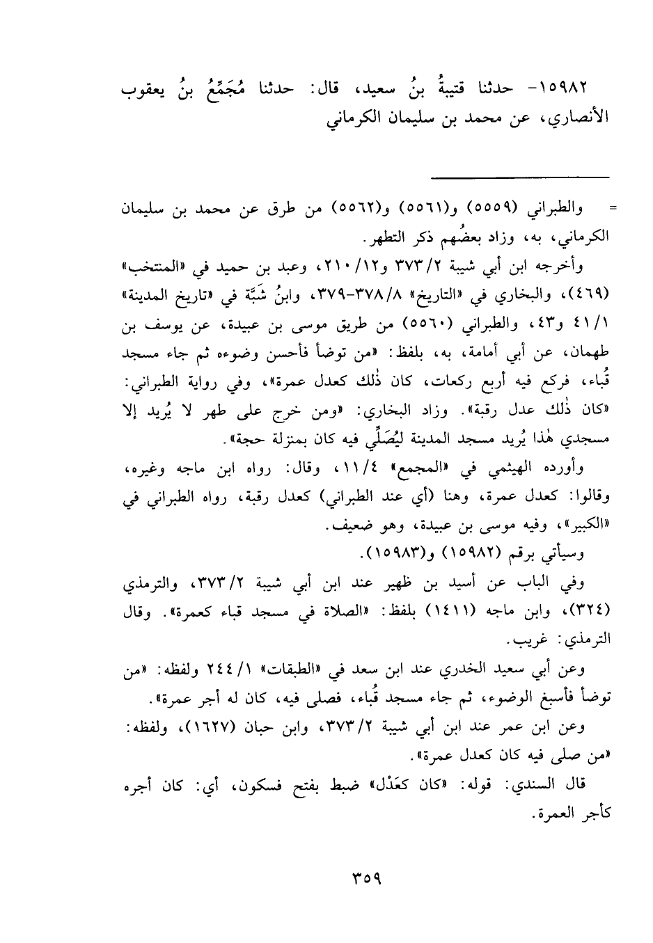 ١٥٩٨٢ - حَدَّثَنَا قُتَيْبَةُ بْنُ سَعِيدٍ، قَالَ: حَدَّثَنَا مُجَمِّعُ بْنُ يَعْقُوبَ الْأَنْصَارِيُّ، عَنْ مُحَمَّدِ بْنِ سُلَيْمَانَ الْكَرْمَانِيِّ،